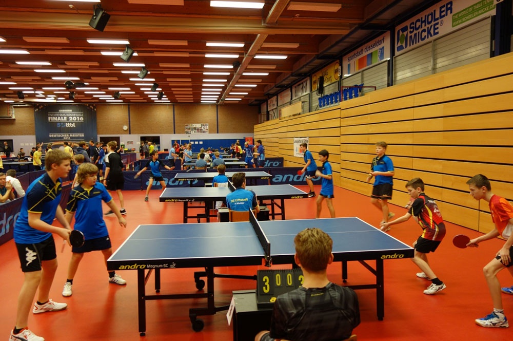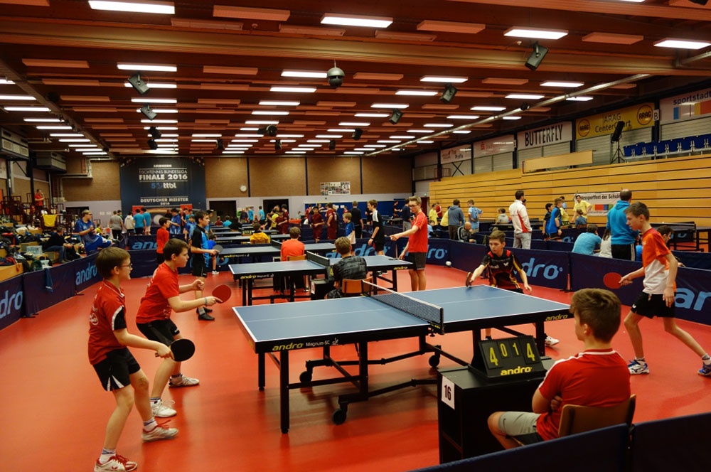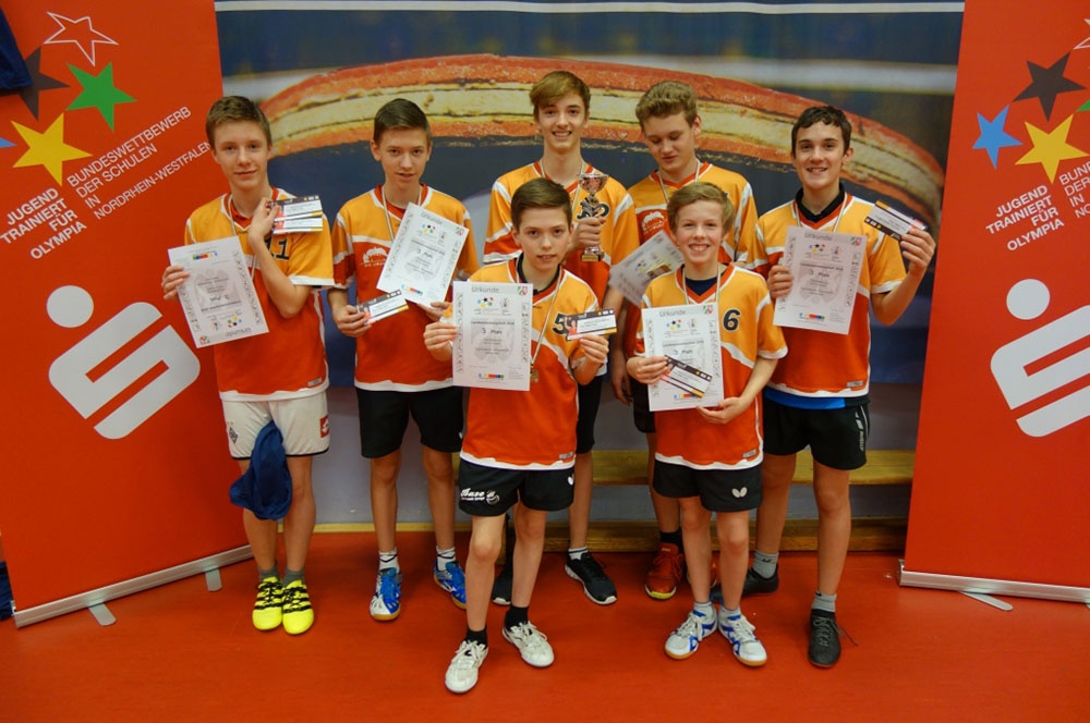 Die Atmosphäre in der Halle, in der sonst u.a. Timo Boll spielt, war besonders und es wurden spannende Spiele. Das erste Spiel gewann das Loburger Team souverän 9:0 gegen das Team aus dem Bezirk Köln. Gegen die Teams aus Düsseldorf und den späteren Landessieger aus dem Bezirk Arnsberg mussten sich die Loburger leider 6:3 und 7:2 geschlagen geben. Das Spiel gegen den Vertreter aus Detmold gewann unsere Mannschaft in einem knappen und umkämpften Spiel mit vielen beeindruckenden Ballwechseln 6:3 und sicherte sich so den Pokal und die Medaillen als drittbeste Schulmannschaft aus Nordrheinwestfalen.