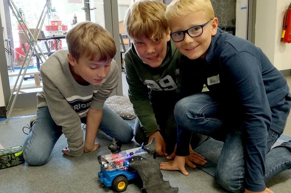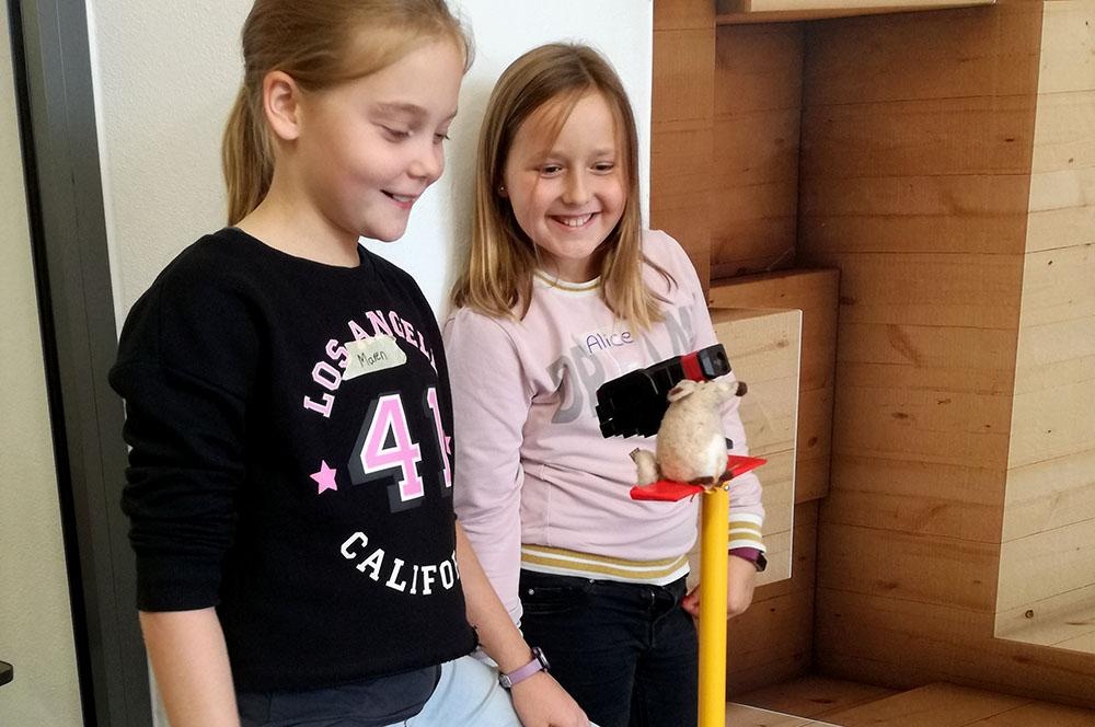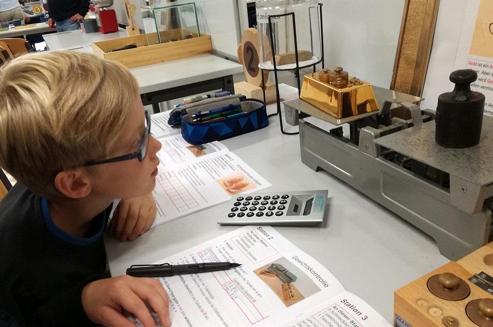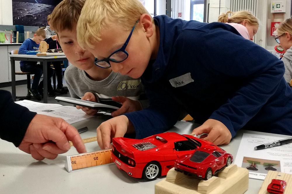 Kaum angekommen im PhänomexX in Ahlen, starteten die SchülerInnen in Teams mit ihrem Forscherheft und eroberten sich die unterschiedlichen Themenwelten: Entfernungen abschätzen wie eine Fledermaus per Echolot, optische Täuschungen im Ames-Zimmer erleben, Fossilien datieren, Sägerochen erforschen, Eisberge zum Schmelzen bringen, Kugelbahnen ausprobieren, Goldbarren wiegen, Diamanten schätzen, die Höhe des Eiffelturms bestimmen , Modellautos mit einem echten Ferrari vergleichen, die Zeitzonen der Erde entdecken, Herrn Celsius im Theaterstück spielen, Fliegen und Honigbienen untersuchen, wie ein Bussard sehen, Wege aus Labyrinthen finden und noch vieles mehr.