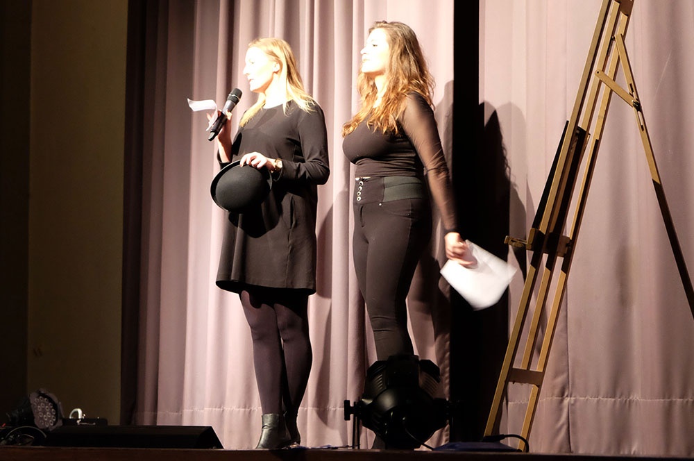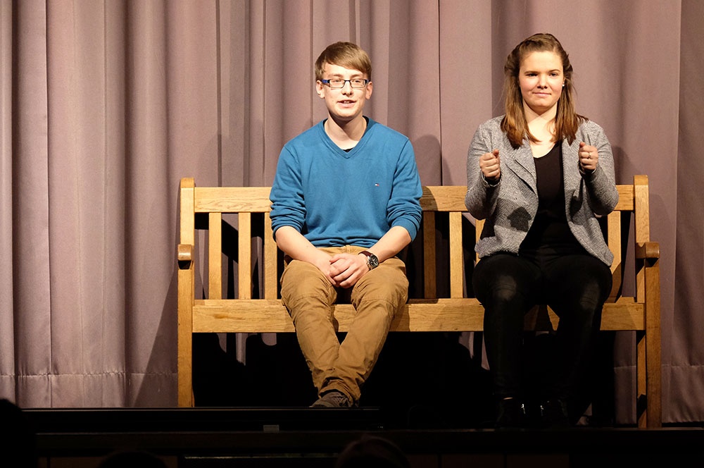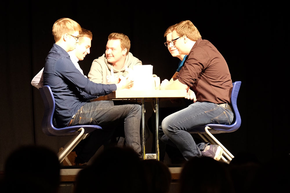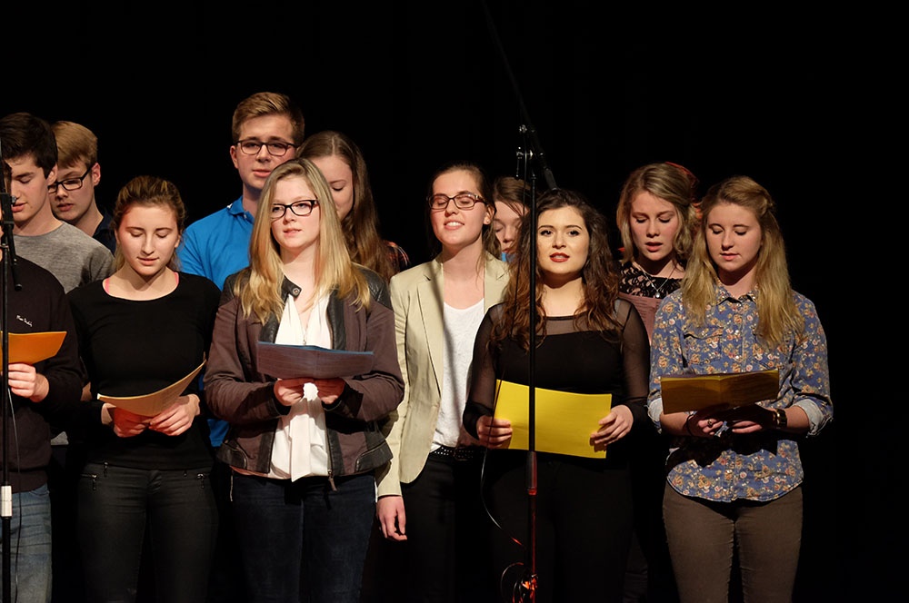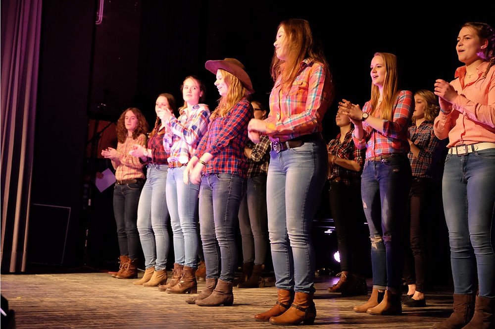 Dann aber ging es los. Kulinarisch durch die Bedienung der Q2er mit Folienkartoffeln, Bretzeln, Zwiebelkuchen, einem halbtrockenen Grauburger, einem Bier, einem Wasser und einer Fanta oder Cola versorgt, erlebten die Zuschauer, diesmal an Tischen in der vollbesetzten Aula sitzend, ein Feuerwerk der Kleinkunst. Der Chor der Q2, der durch die Stimmen der „männlichen westfälischen Nachtigallen“ auch manchmal zum Schmunzeln anregte, trug einige Popsongs vor. Klasse war das „dröge“ vorgetragene Solo von Jan-Hinrich Schierhölter, begleitet von Nikon Kudratov an der Gitarre, der die Zahnschmerzen im umgedichteten Song „Lady in black“ gerne in Kauf nahm, um die schöne Zahnarzthelferin wiederzusehen. Ob der Tanz der Mädels in Western-Klamotten oder die eine oder andere ernste Darbietung, darunter auch „Der Wassertropfen“ von dem durch die Moderatoren als „Shooting Star“ des Kollegiums anmoderierten Julian Suhre, alles wurde mit herzlichem Applaus des Publikums quittiert. Kurze Sketche, von diversen Stufenmitgliedern gespielt, rundeten den Abend ab und die eine oder andere kleinere technische Panne trug zur Erheiterung des Publikums und zum Charme der Veranstaltung bei.