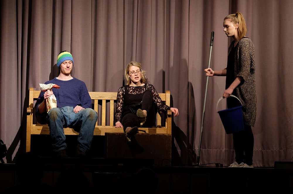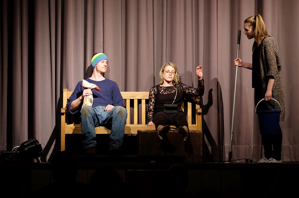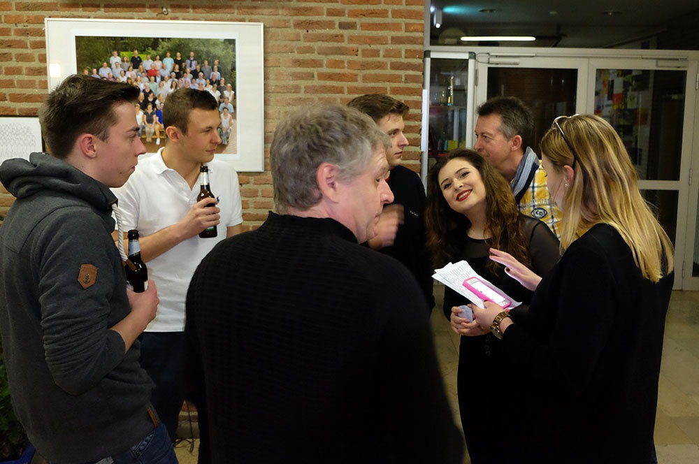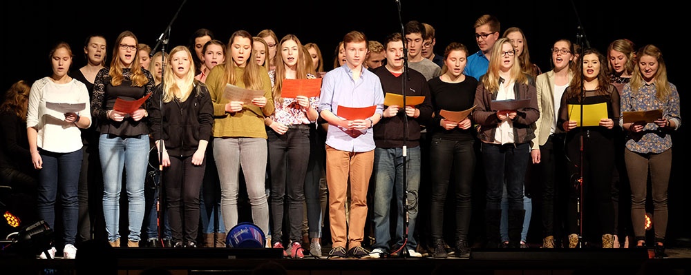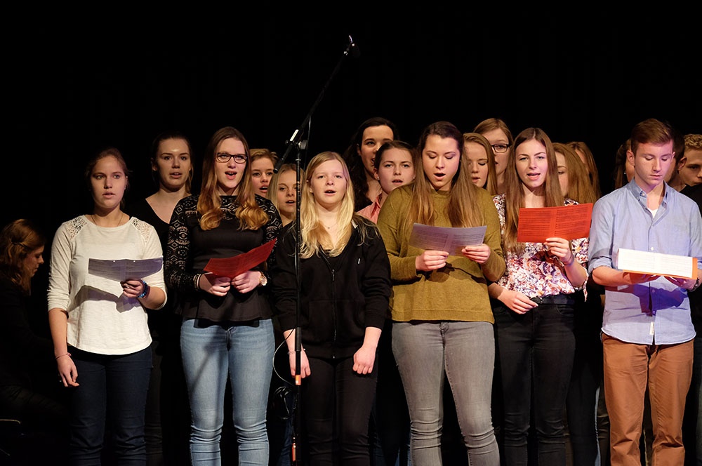 Dann aber ging es los. Kulinarisch durch die Bedienung der Q2er mit Folienkartoffeln, Bretzeln, Zwiebelkuchen, einem halbtrockenen Grauburger, einem Bier, einem Wasser und einer Fanta oder Cola versorgt, erlebten die Zuschauer, diesmal an Tischen in der vollbesetzten Aula sitzend, ein Feuerwerk der Kleinkunst. Der Chor der Q2, der durch die Stimmen der „männlichen westfälischen Nachtigallen“ auch manchmal zum Schmunzeln anregte, trug einige Popsongs vor. Klasse war das „dröge“ vorgetragene Solo von Jan-Hinrich Schierhölter, begleitet von Nikon Kudratov an der Gitarre, der die Zahnschmerzen im umgedichteten Song „Lady in black“ gerne in Kauf nahm, um die schöne Zahnarzthelferin wiederzusehen. Ob der Tanz der Mädels in Western-Klamotten oder die eine oder andere ernste Darbietung, darunter auch „Der Wassertropfen“ von dem durch die Moderatoren als „Shooting Star“ des Kollegiums anmoderierten Julian Suhre, alles wurde mit herzlichem Applaus des Publikums quittiert. Kurze Sketche, von diversen Stufenmitgliedern gespielt, rundeten den Abend ab und die eine oder andere kleinere technische Panne trug zur Erheiterung des Publikums und zum Charme der Veranstaltung bei.