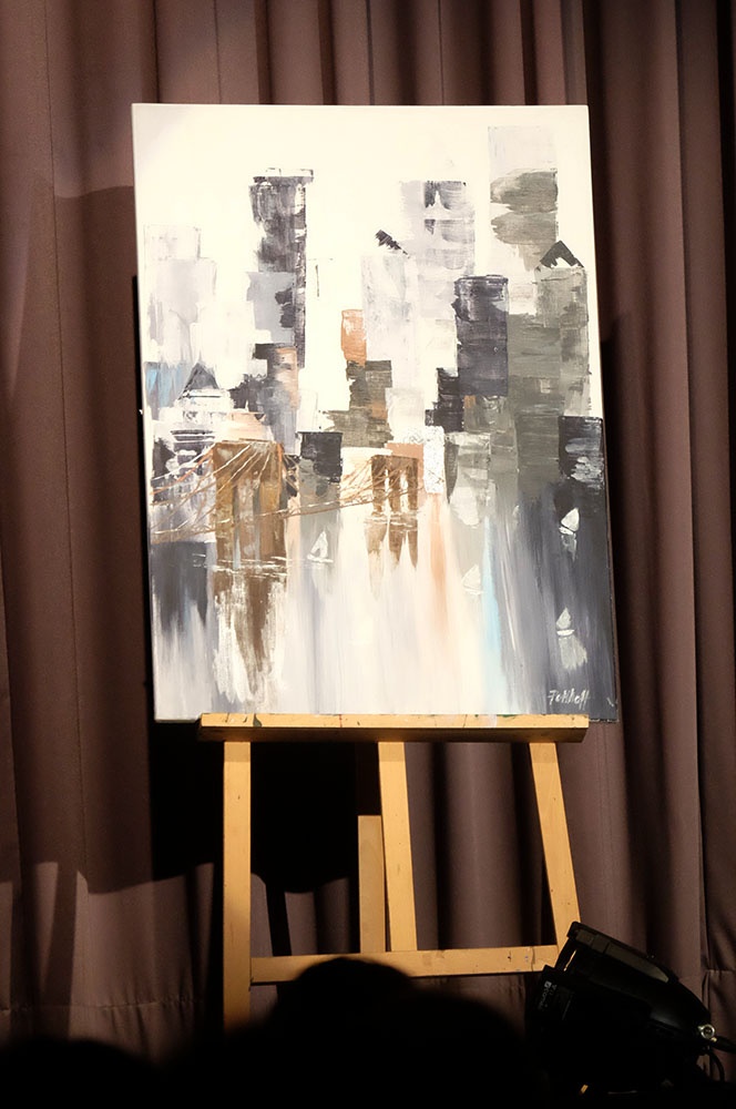 Nachdem Julian Kolorz zuvor schon gesungen hatte „We need some Dollars“ sorgte Joanne Potthoff für zahlreiche Lacher bei der Versteigerung ihres eigenen Kunstwerks „New York“ zu Gunsten der Kosten der zukünftigen Abifeierlichkeiten: „Papa, biete mal mit! Da geht noch was! Und warum gehen wir denn überhaupt arbeiten?“