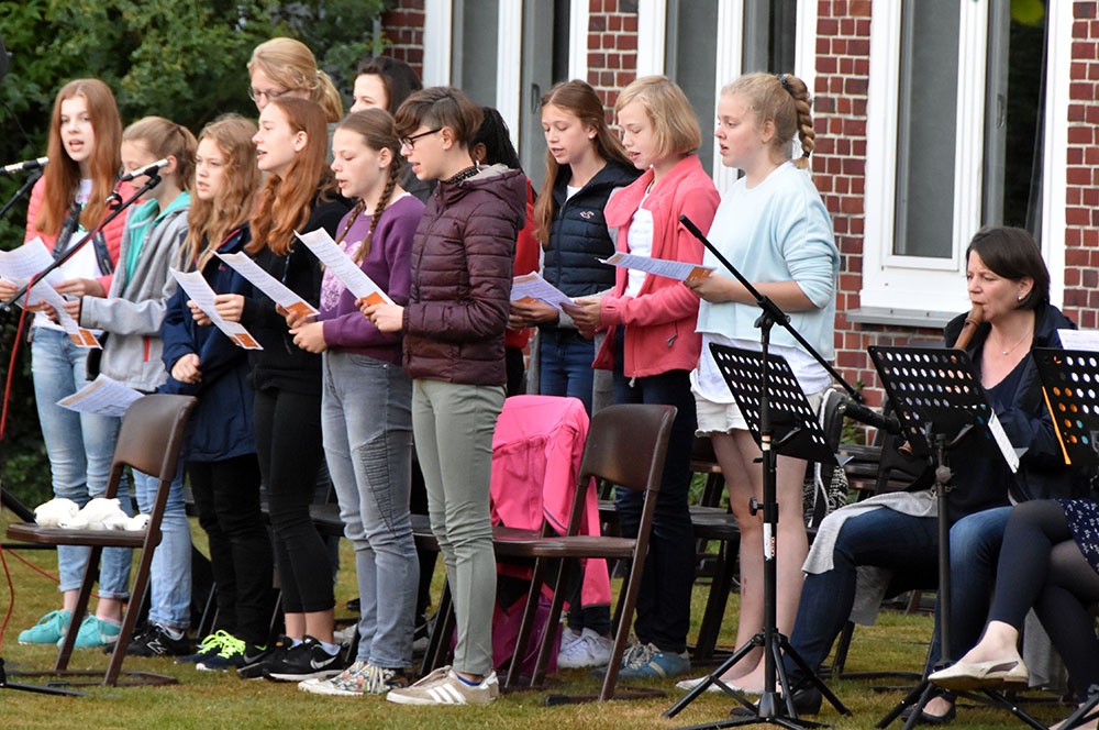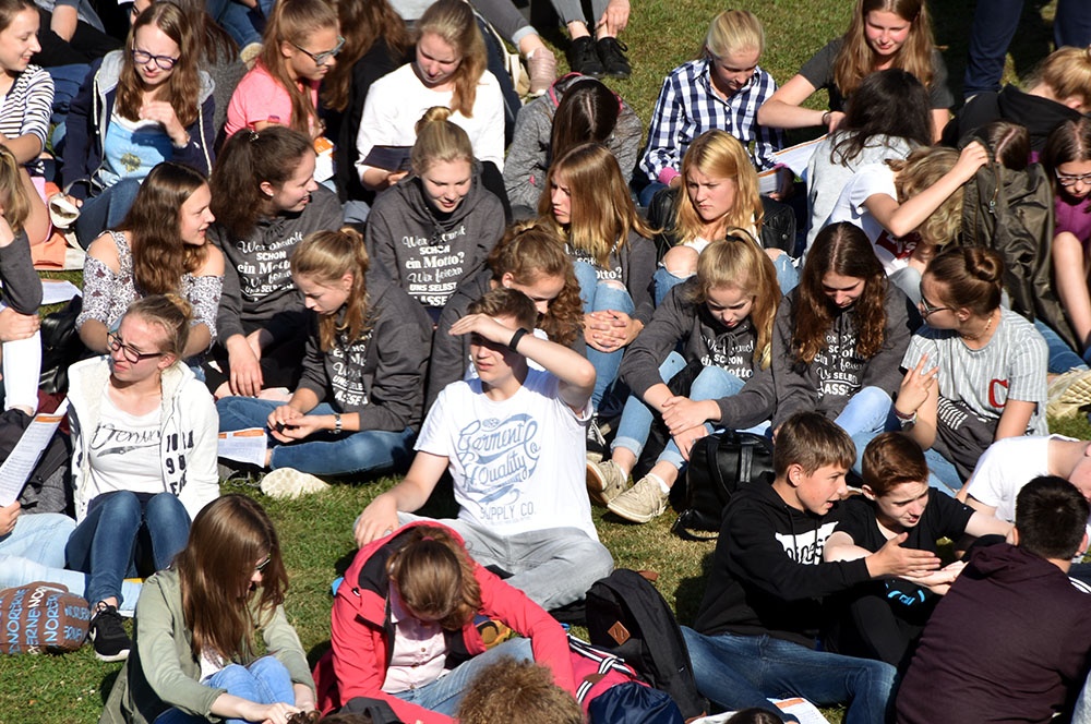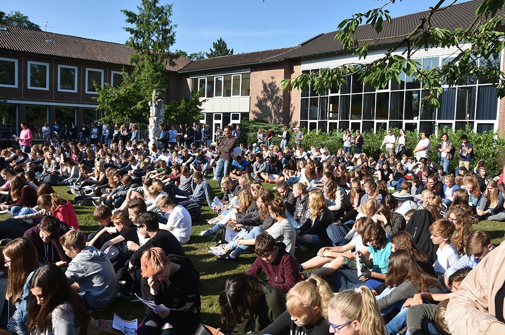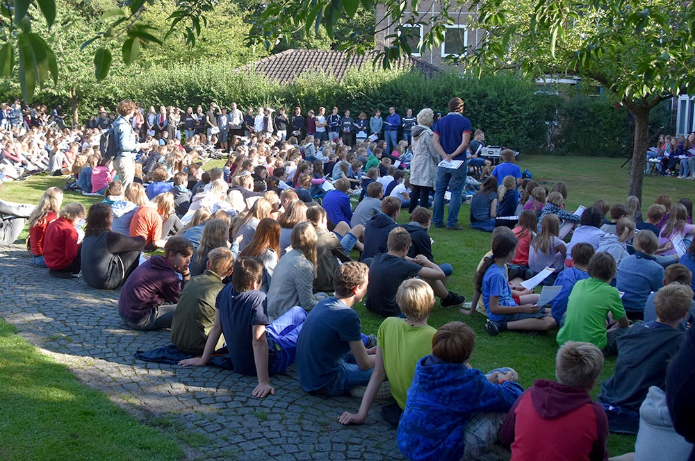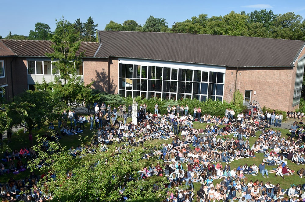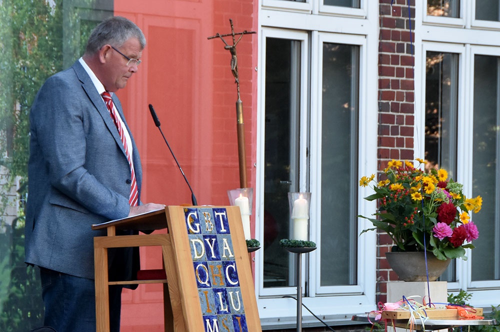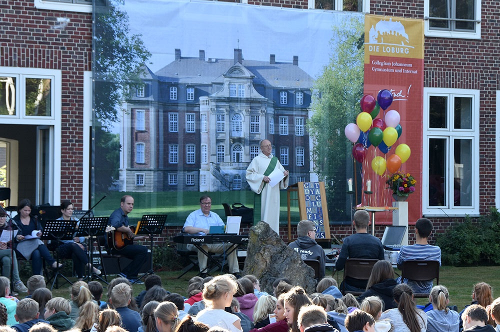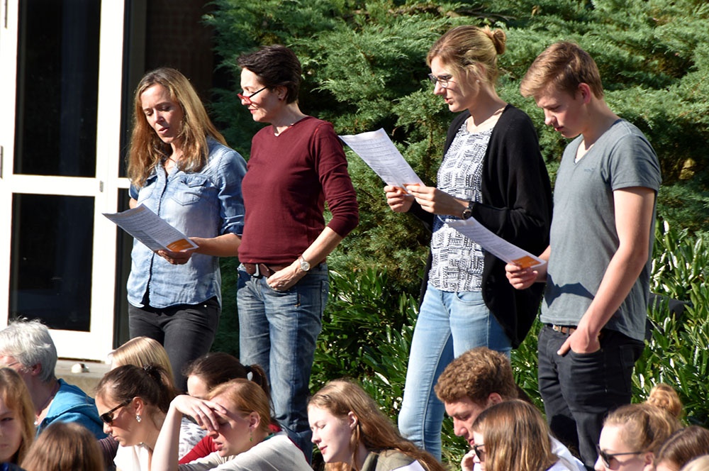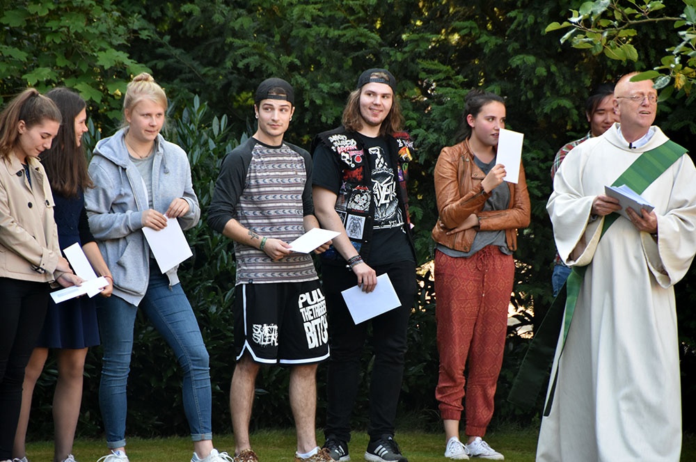 Schülerinnen und Schüler wurden von Schulseelsorger Wolfgang Rensinghoff bei bestem Wetter in die Ferien geschickt.