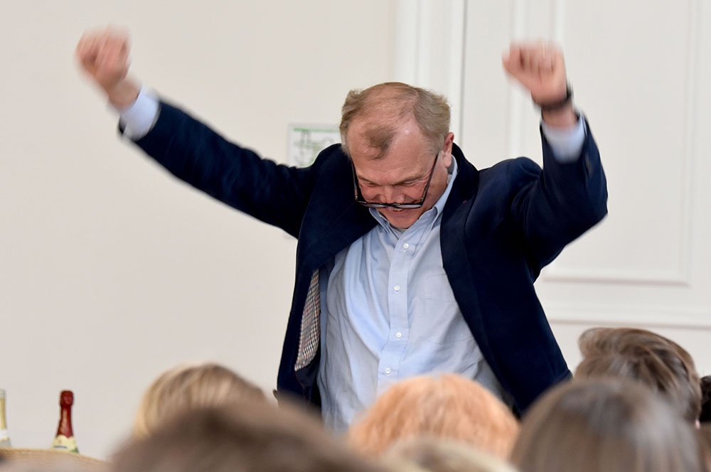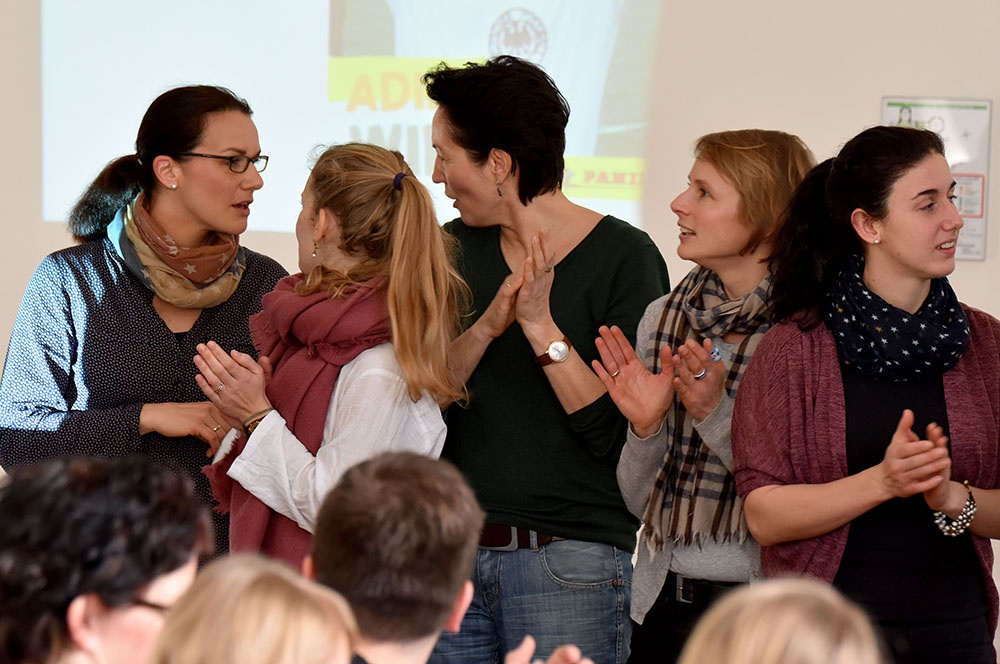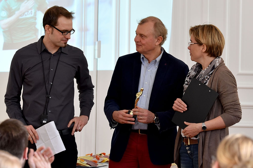 Nach der Zeugnisausgabe versammelten sich die Kollegen dann im Rittersaal, um Winfried Rösel in den Vorruhestand zu entlassen. Neben dem Schulleiter Michael Bertels ergriffen auch die Vertreter der Fachschaften Erdkunde und Sport das Wort, um die Qualitäten Winfried Rösels hervorzuheben und zu verdeutlichen, dass mit ihm ein Original die Loburg verlässt – so verdeutlichte Frau Schöne im Namen der Fachschaft Erdkunde humorvoll, dass sein Name buchstäblich sein Programm ist. Diese Qualitäten nahmen Birga Pfitzner und Thorsten Wanke als die Vertreter der Fachschaft Sport auf und ordneten sie direkt dem „Teamplayer“ Rösel zu.