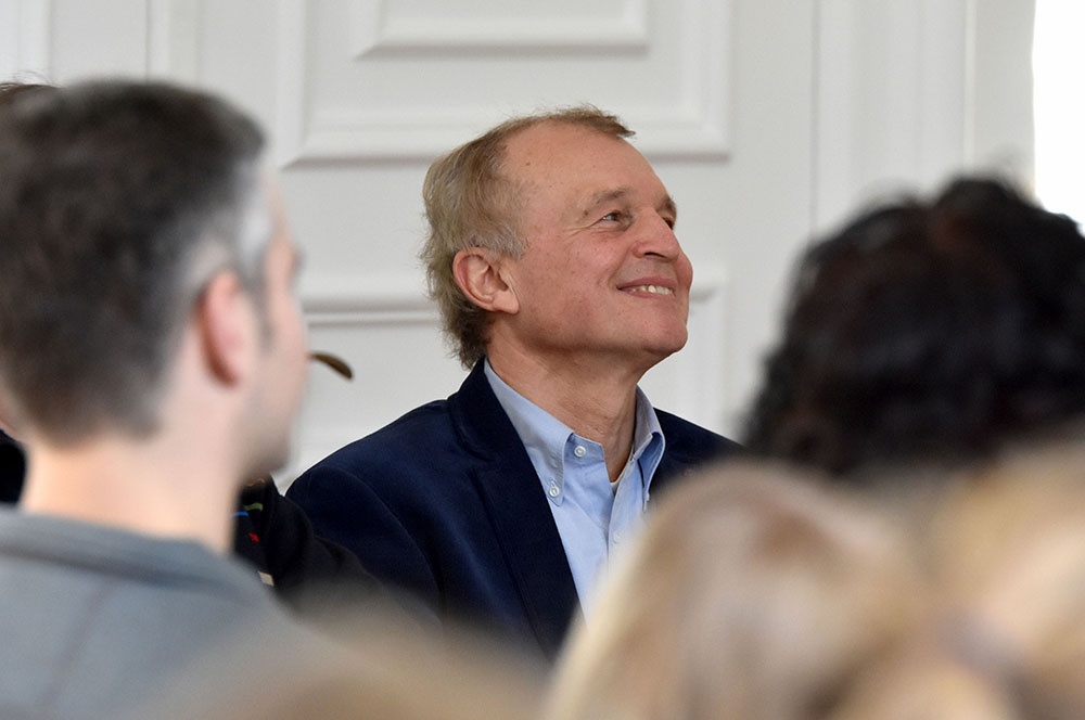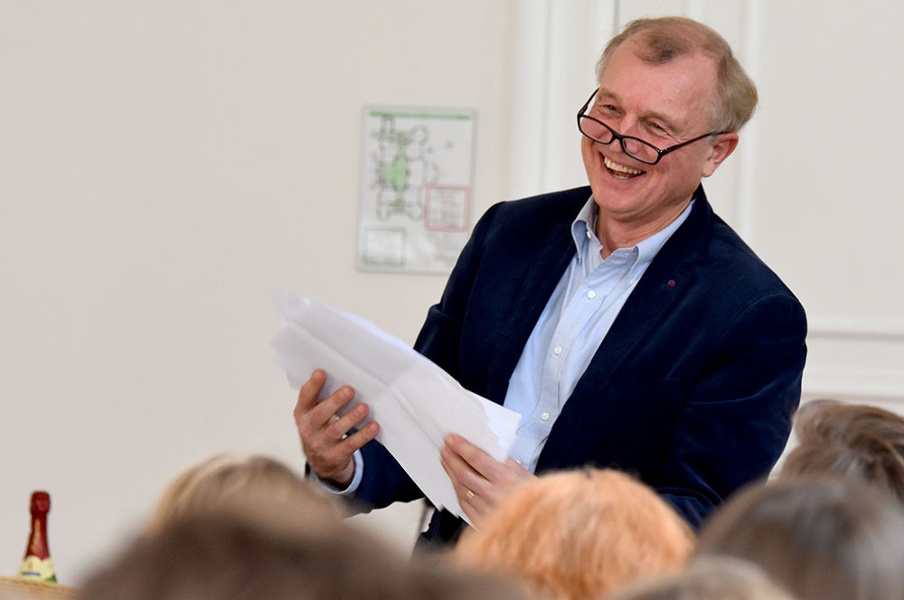 Er selbst stellte seine Abschiedsworte unter die Frage „Was ist Glück?“ und begann mit einem kurzen Rückblick auf seinen Lehreralltag: Es ist schon erstaunlich, was in einem Lehrerleben so an Materialsammlungen, Korrekturen, Abiturprüfungen und außerunterrichtlichen Events zusammenkommt! Die Fachschaft Erdkunde freute sich dann auch, dass er ihnen seinen ergiebigen Materialfundus in digitaler Form überreichte.
