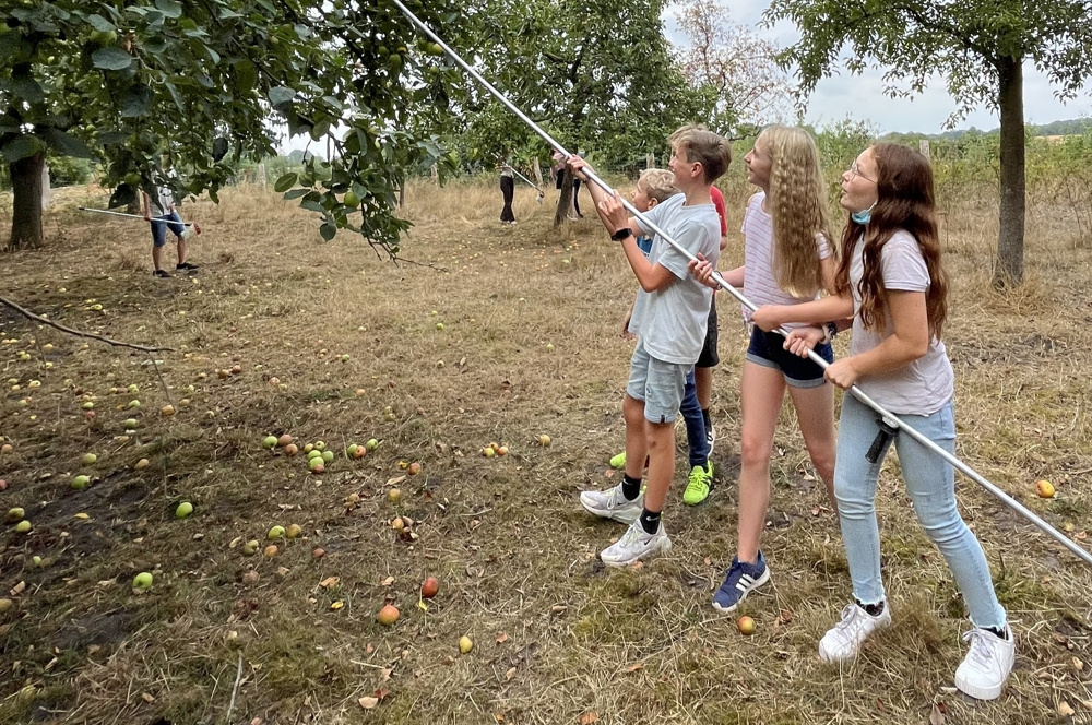 Endlich war es wieder so weit! Am Mittwoch, den 07.09. sammelten der EF Chemiekurs von Frau Sur, die 6a von Frau Blömker und auch der EF Sportkurs von Frau Hardenberg Birnen und Äpfel auf der Streuobstwiese. Alle Schüler*innen und Lehrer*innen haben tatkräftig mit angepackt. Diese Aktion wiederholte sich am Montag, den 12.09. mit dem EF Biokurs von Herrn Pickel. Dort wurden erneut einige Kisten mit Obst gefüllt.
