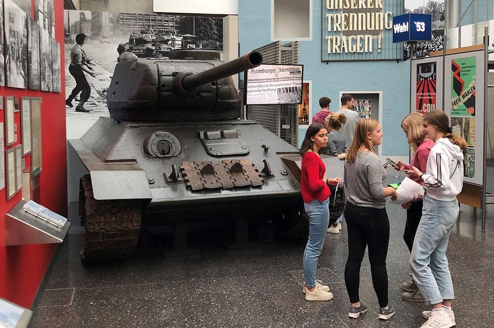 Beim Gang durch das Haus empfanden die SuS den auffordernden Charakter der verschiedenen Ausstellungsbereiche als besonders ansprechend. „Die Möglichkeit selbst im Bundestag über politische Fragen abzustimmen, fand ich super!“, äußerte etwa Carina aus der EFc. Auch die vielen Originalgegenstände hinterließen mächtig Eindruck bei den Loburgern. „Mich haben die Steine von der Berliner Mauer am meisten beeindruckt!“, betonte Julia aus der EFf. Daneben waren der ausgestellte Originalpanzer, der zur Niederschlagung des Aufstandes am 17. Juni 1953 eingesetzt wurde, oder die zahlreichen Wahlplakate aus den verschiedensten Jahrzenten echte Hingucker. Als Bonbon für all diejenigen, die darüber hinaus noch ein bisschen „um die Wette denken“ wollten, bot eine „Actionbound-Challenge“, die Möglichkeit sein Wissen über die deutsche und europäische Geschichte in Kleingruppen zu beweisen und sich am Smartphone mit anderen Gruppen zu messen.
