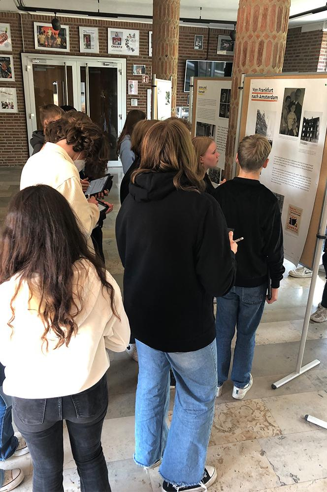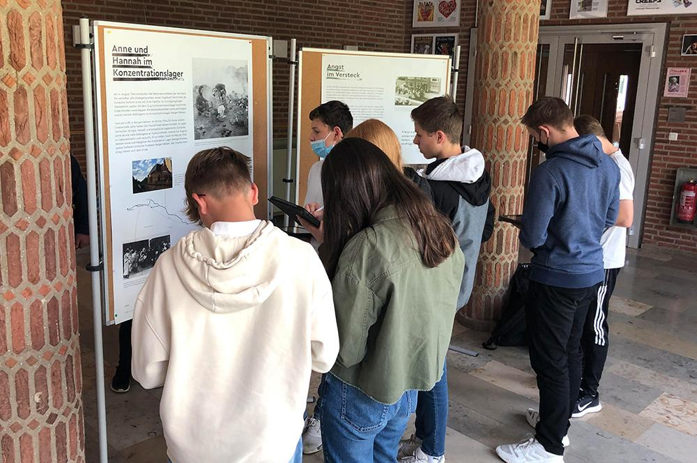 Die Schüler*innen der 9d im Geschichtsunterricht von Frau Grothues haben sich zunächst mit der Anne Frank Zeitung beschäftigt, indem sie sich über das Leben von Anne Frank und ihrer Familie, sowie über die historischen Hintergründe informierten. Anschließend schauten sie das vom Anne Frank Zentrum entwickelte Video-Interview mit Anne Franks Freundin Hannah Pick-Goslar, die den Holocaust überlebt hat und über ihre Freundschaft zu Anne Frank eindrucksvoll berichtet. Zum Abschluss besuchte die Klasse die im Foyer aufgebaute Plakatausstellung und beantwortete Fragen zu den einzelnen Plakaten, die anschließend in der Klasse besprochen wurden.