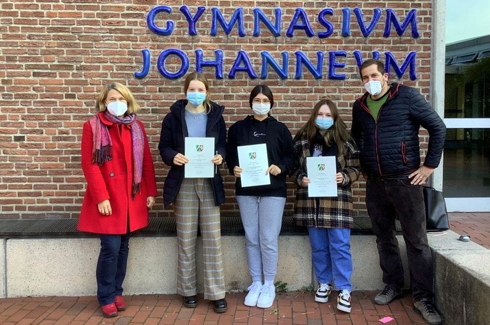 Für ihre wirklich ansprechenden, ideenreichen, kreativen bis philosophischen Beiträge wurde den ausschließlich weiblichen Teilnehmerinnen (Ana Martinic, Clara Bisping, Aleyna Köz, Julie Schormann, Alvina Nowacka) im Rahmen einer Urkundenüberreichung nun durch die betreuenden Lehrkräfte Fr. Mai-Schier und Hr. Flothkötter gedankt.