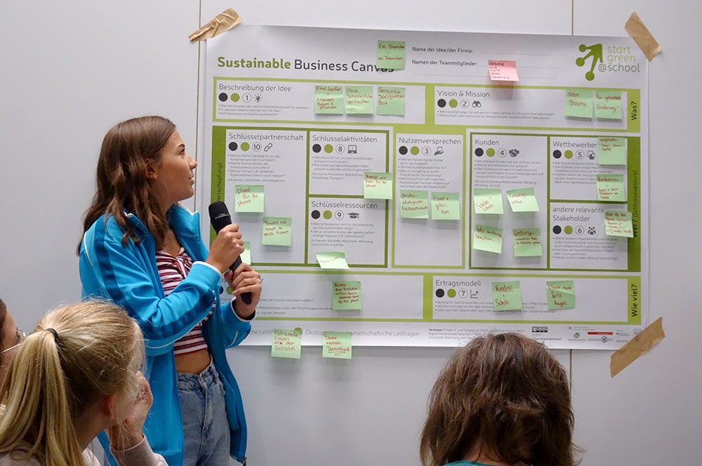 Am Nachmittag haben sie an einem Gründungscamp für Schülerinnen und Schüler teilgenommen, bei dem sie in einem 2-stündigen Workshop mit dem Sustainable Buisiness Canvas eine nachhaltige Geschäftsidee entwickeln konnten, die sich in der Schule umsetzen lässt.