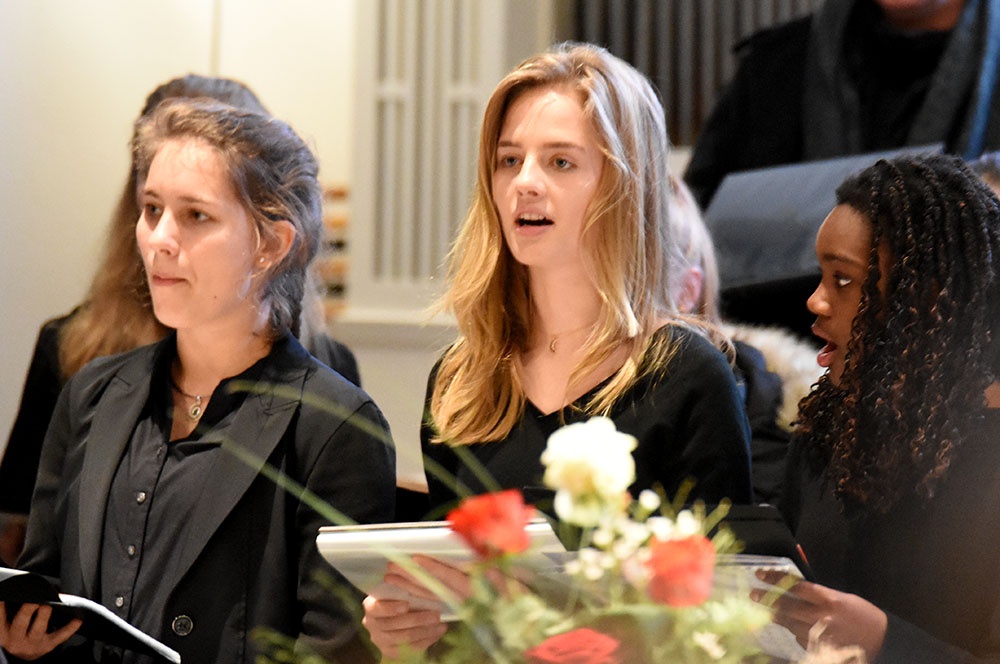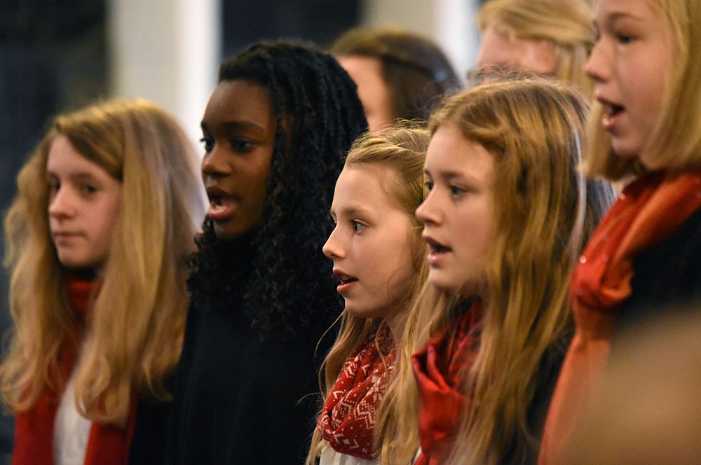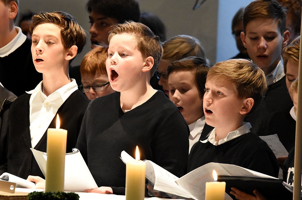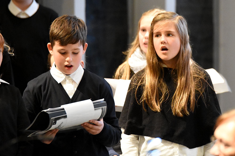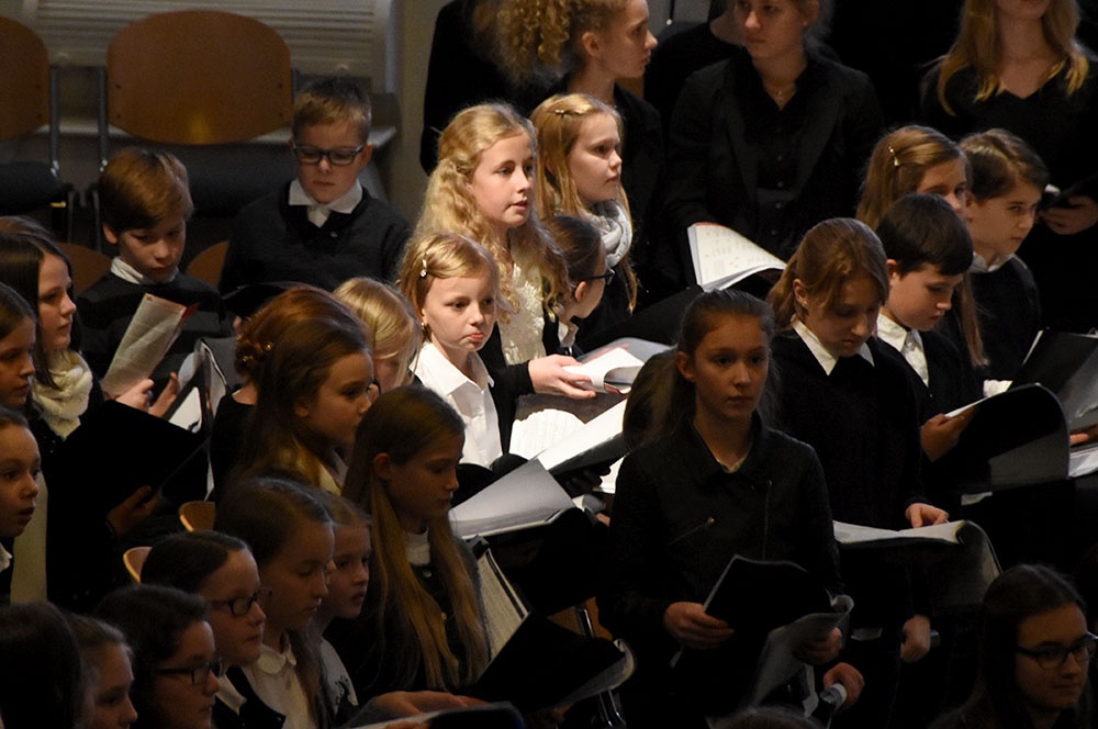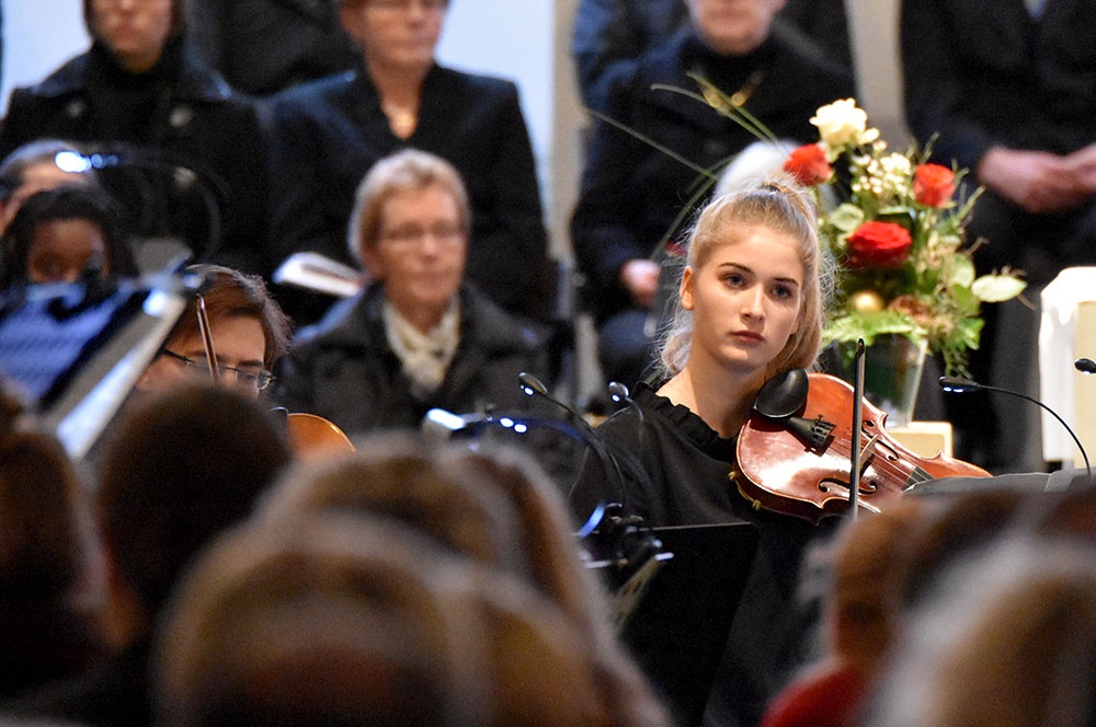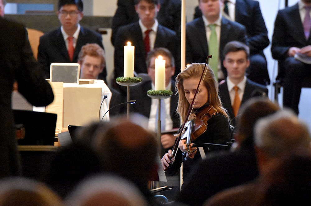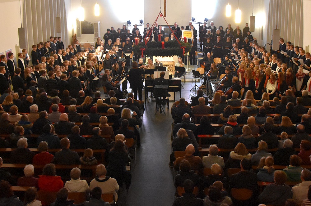 Gleich zu Beginn schuf der Unterstufenchor mit drei adventlichen Liedern eine entspannte Atmosphäre und ließ das Publikum den vorweihnachtlichen Stress vergessen. Die Capella nahm das adventliche Motiv des Lichts in der Dunkelheit auf und brillierte vor allem mit einer Bearbeitung des Liedes „Veni, veni Emanuel“. Anspruchsvolle Arrangements brachte das Kammerorchester zu Gehör, woran sich die Sisters mit „Listen“ und „You are my all in all“ anschlossen. Bis zum gemeinsamen Lied „Macht hoch die Tür“ gab es neben der bekannten Melodie „Maria durch ein Dornwald ging“ auch das weniger bekannte „Wir tragen dein Licht“ zu hören. An dieser Stelle wurde es besonders stimmungsvoll, da die Sisters mit Kerzen durch die Kirche gingen und die auf den Bänken stehenden Teelichter entzündet haben, die dann für den Rest des Konzerts die Kirche in warmen Kerzenschein hüllten.