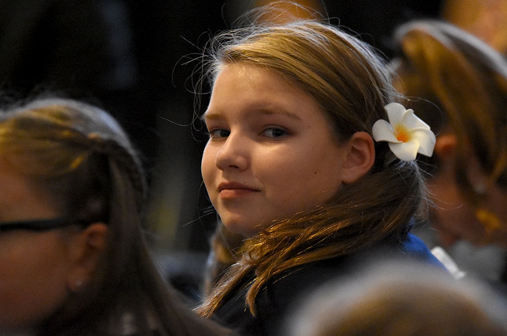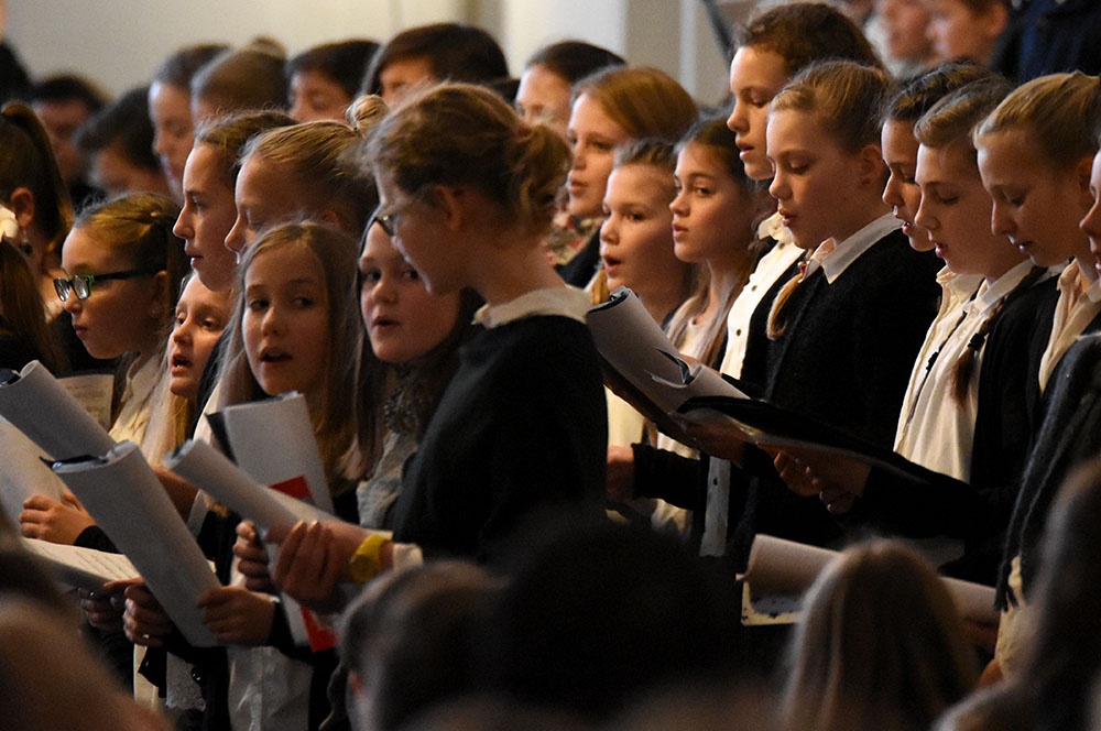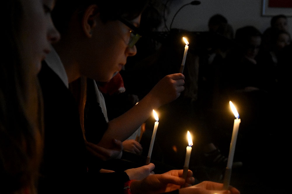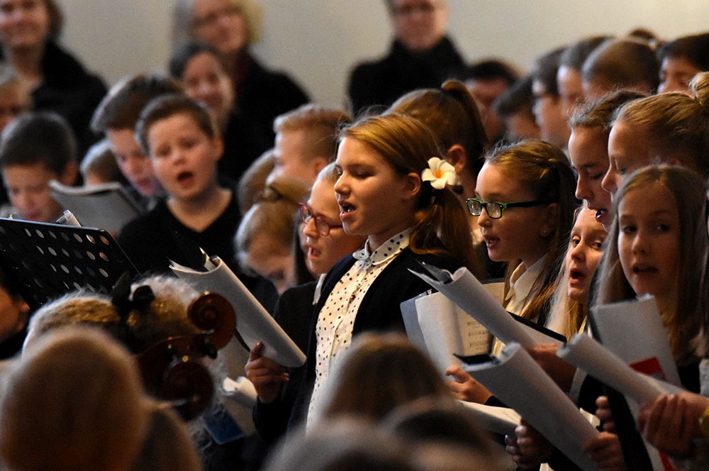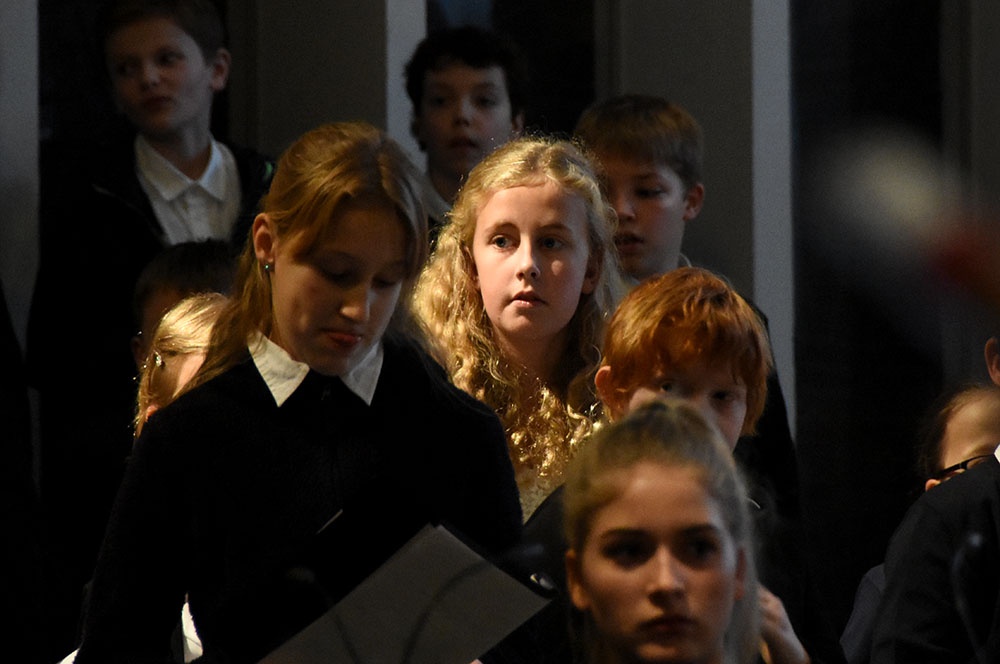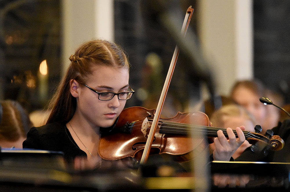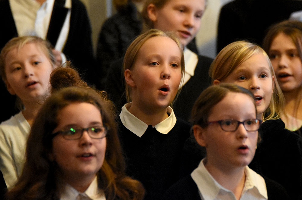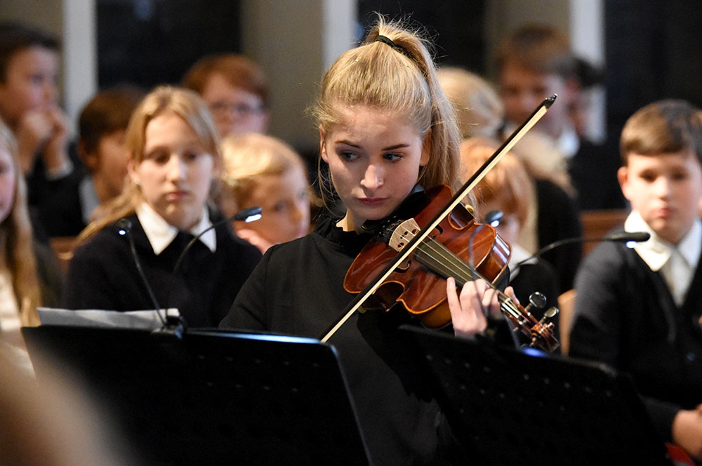 Gleich zu Beginn schuf der Unterstufenchor mit drei adventlichen Liedern eine entspannte Atmosphäre und ließ das Publikum den vorweihnachtlichen Stress vergessen. Die Capella nahm das adventliche Motiv des Lichts in der Dunkelheit auf und brillierte vor allem mit einer Bearbeitung des Liedes „Veni, veni Emanuel“. Anspruchsvolle Arrangements brachte das Kammerorchester zu Gehör, woran sich die Sisters mit „Listen“ und „You are my all in all“ anschlossen. Bis zum gemeinsamen Lied „Macht hoch die Tür“ gab es neben der bekannten Melodie „Maria durch ein Dornwald ging“ auch das weniger bekannte „Wir tragen dein Licht“ zu hören. An dieser Stelle wurde es besonders stimmungsvoll, da die Sisters mit Kerzen durch die Kirche gingen und die auf den Bänken stehenden Teelichter entzündet haben, die dann für den Rest des Konzerts die Kirche in warmen Kerzenschein hüllten.