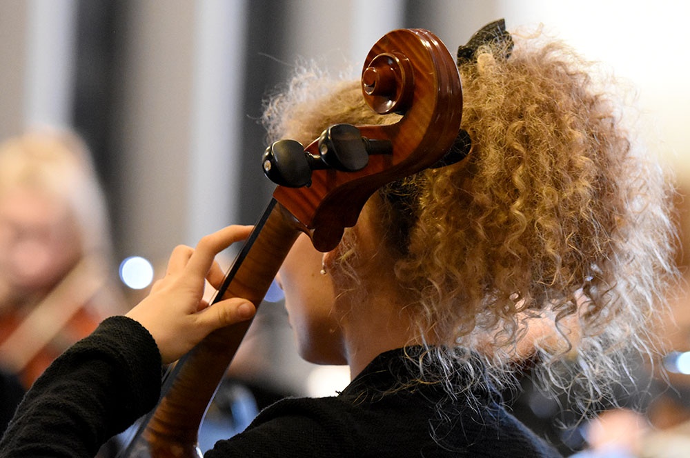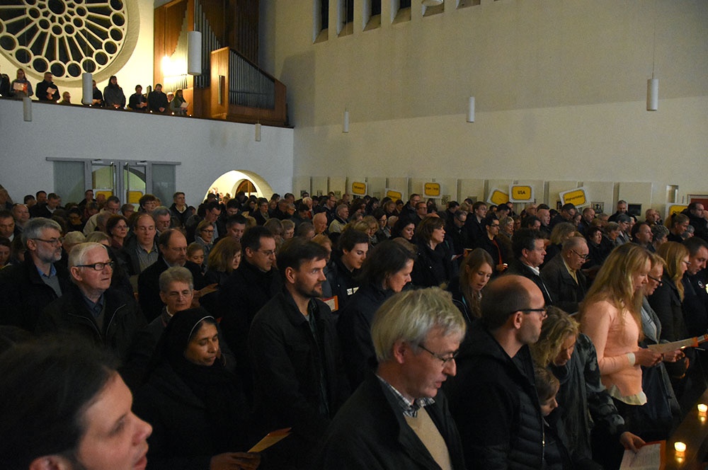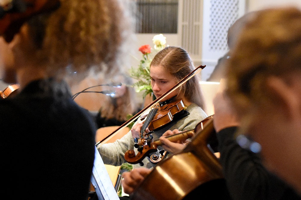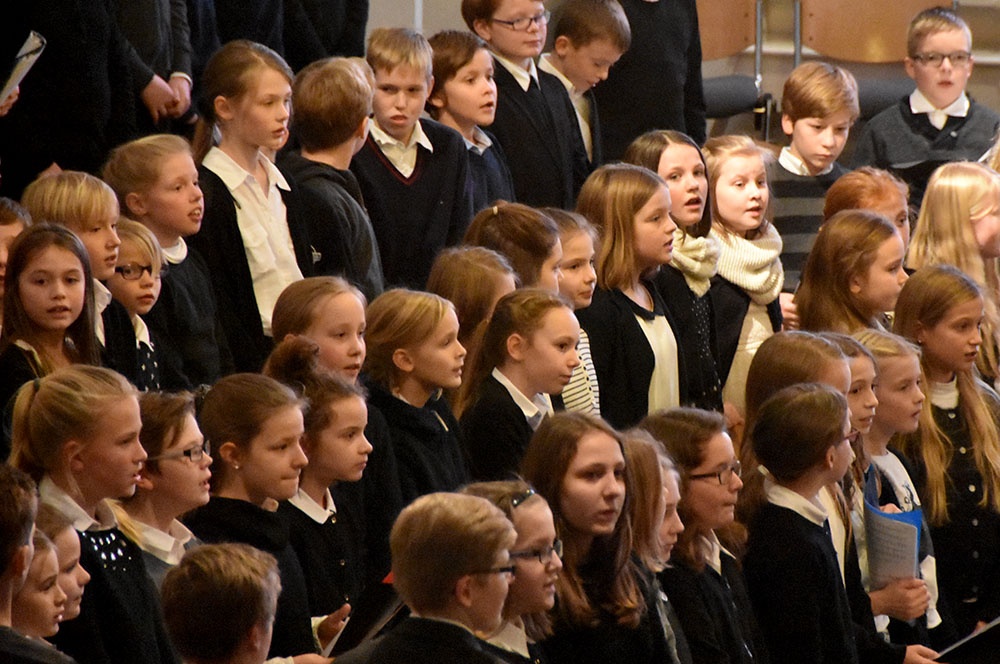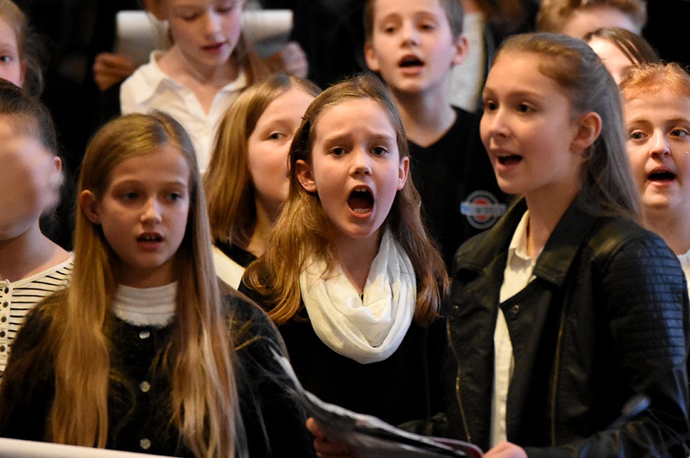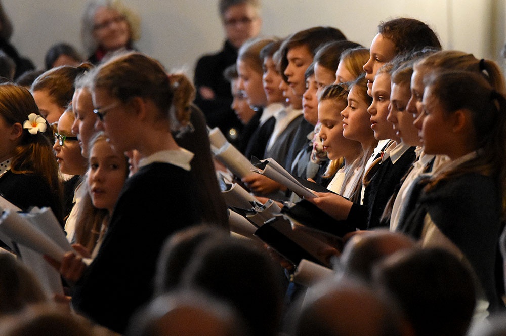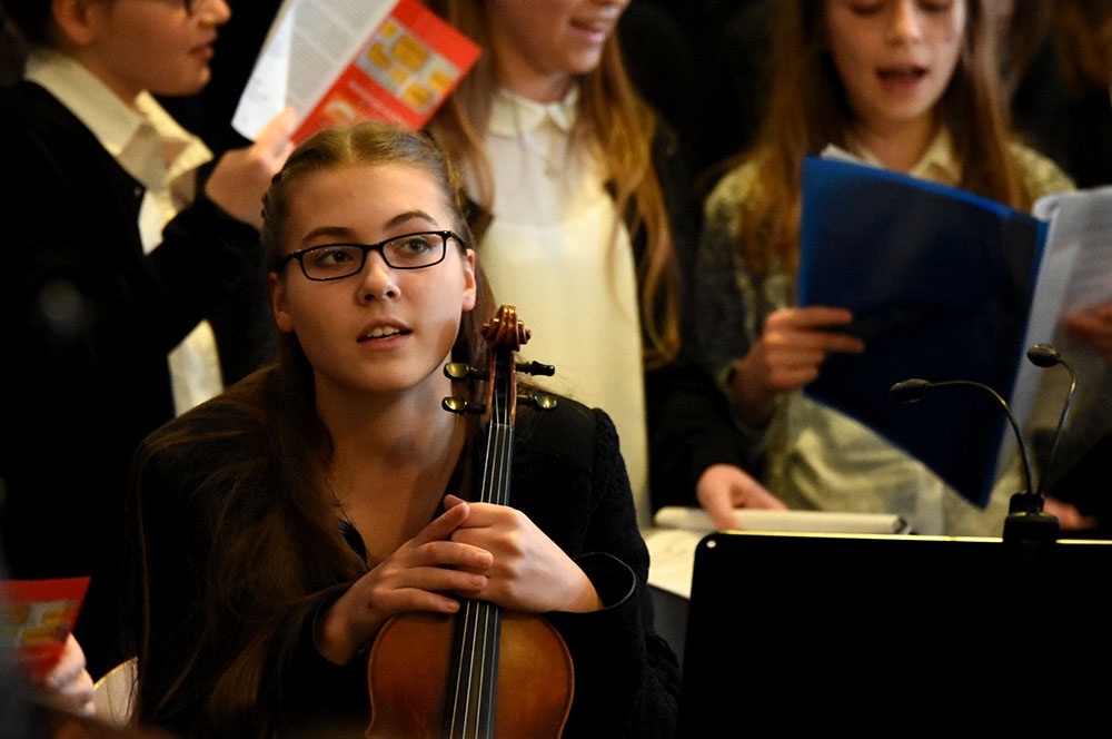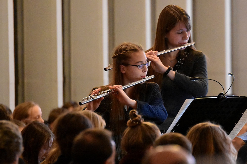 Gleich zu Beginn schuf der Unterstufenchor mit drei adventlichen Liedern eine entspannte Atmosphäre und ließ das Publikum den vorweihnachtlichen Stress vergessen. Die Capella nahm das adventliche Motiv des Lichts in der Dunkelheit auf und brillierte vor allem mit einer Bearbeitung des Liedes „Veni, veni Emanuel“. Anspruchsvolle Arrangements brachte das Kammerorchester zu Gehör, woran sich die Sisters mit „Listen“ und „You are my all in all“ anschlossen. Bis zum gemeinsamen Lied „Macht hoch die Tür“ gab es neben der bekannten Melodie „Maria durch ein Dornwald ging“ auch das weniger bekannte „Wir tragen dein Licht“ zu hören. An dieser Stelle wurde es besonders stimmungsvoll, da die Sisters mit Kerzen durch die Kirche gingen und die auf den Bänken stehenden Teelichter entzündet haben, die dann für den Rest des Konzerts die Kirche in warmen Kerzenschein hüllten.