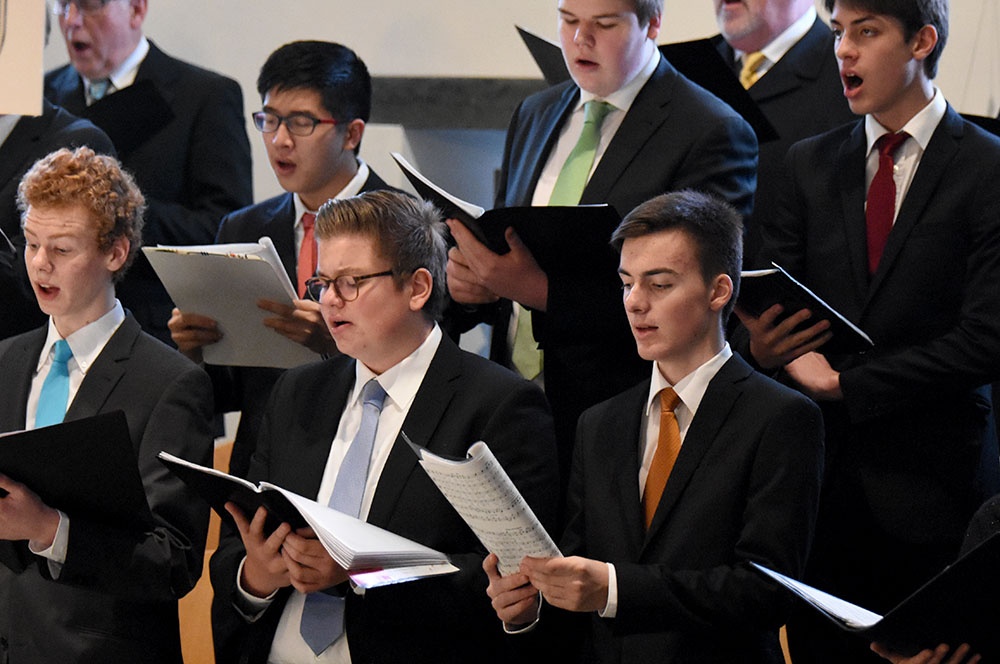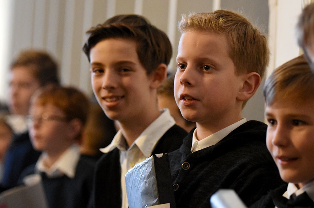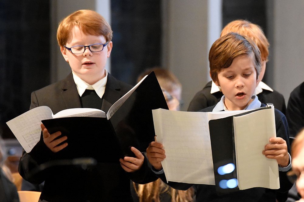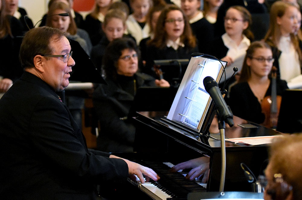 Bevor zum Finale alle Mitwirkenden (Knabenchor, Sisters, Capella, sowie der Unterstufenchor der Jahrgangsstufen 5 und 6) stimmgewaltig „Joy tot he world“ und „Tollite hostias“ sangen, dankte Musiklehrer Matthias Hellmons dem Schulseelsorger Wolfgang Rensinghoff für dessen Engagement und vielseitige Arbeit während des gesamten Jahres.