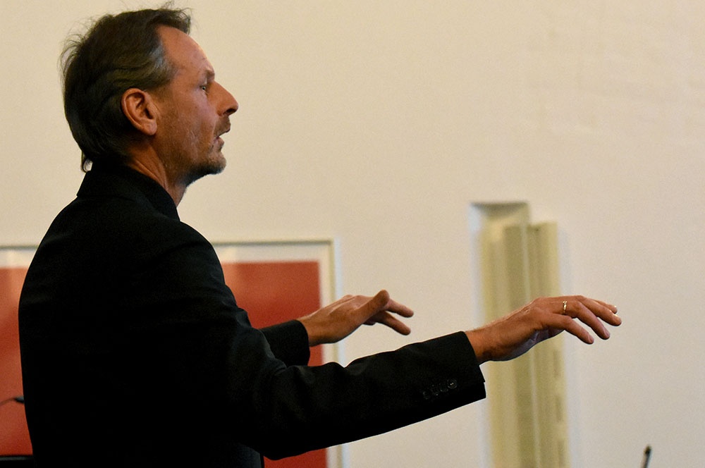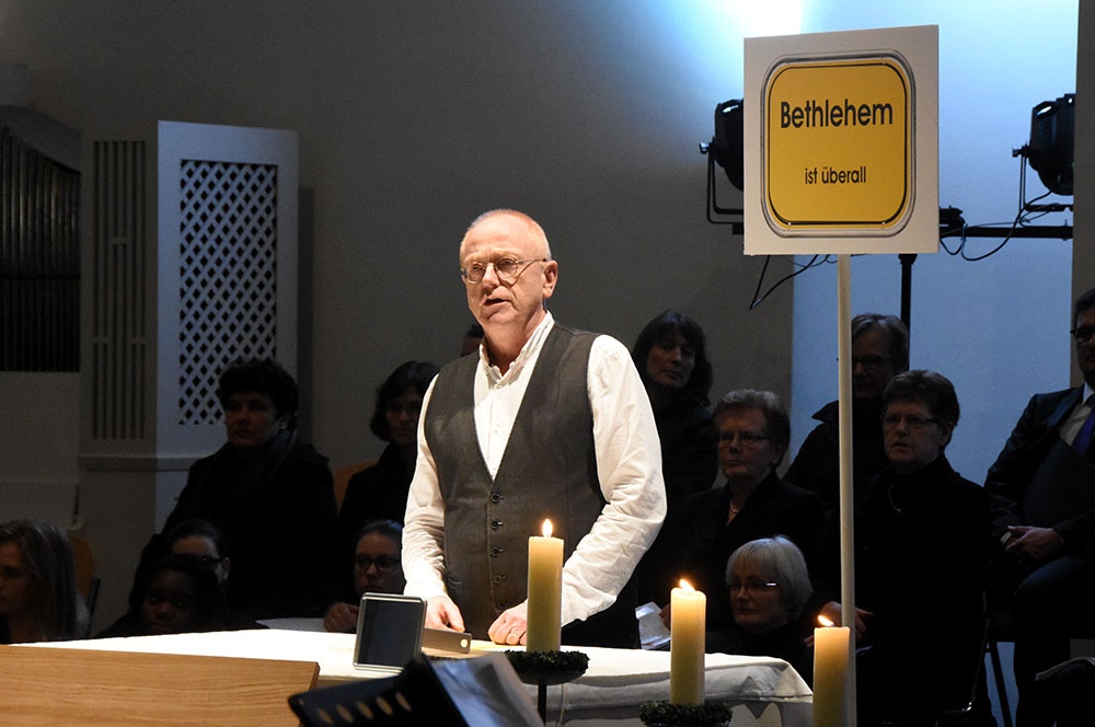 Schulseelsorger Wolfgang Rensinghoff, der am Ende des 1. Teils in das diesjährige Motto des Loburger Advents „Bethlehem ist überall“ einführte, knüpfte an dieses Lichtmotiv insofern an, als er darauf einging, dass auch heute viele Menschen in Dunkelheit leben, was er am Beispiel der verschiedenen „Ortsschilder“ erläuterte. Doch durch das Wunder der Weihnacht sind wir Christen zuversichtlich, dass man die Dunkelheit durchbrechen kann. Wir sollten aber nicht übersehen, dass auch wir dazu beitragen können und müssen, dass Betlehem überall ist. Denn wir können Bethlehem für Menschen sein und umgekehrt, wozu man keine besonderen Fähigkeiten haben muss, wie er mit seiner Geschichte „Engel ohne Flügel“ verdeutlichte. Abgerundet wurden diese Gedanken durch das von allen Musikensembles gemeinsam gesungene Lied „Sage, wo ist Bethlehem“, dessen Musik Matthias Hellmons 2014 eigens für die Adventskonzerte komponiert hat.