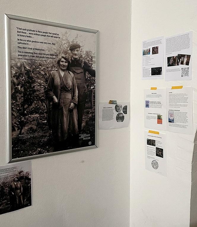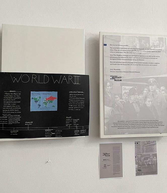 Die 9er haben sich mit der Ausstellung an sich beschäftigt. Wir haben uns mit dem Leben von Kindern während des Zweiten Weltkriegs beschäftigt und haben uns dafür mit der Kinder- und Jugendserie Der Krieg und ich auseinandergesetzt. Man hat da einiges über die Kriegserlebnisse von Kindern aus verschiedenen europäischen Ländern erfahren. Wir haben uns aber auch mit dem Verlauf des Zweiten Weltkriegs beschäftigt oder mit gegenwärtigem Rassismus. In unserem Selbstlernzentrum gibt es einige Bücher zum Thema und da haben wir auch Buchrezensionen geschrieben. Unsere Poster und Ergebnisse haben wir dann ins Englische übersetzt und sie ergänzen die Ausstellung nun.