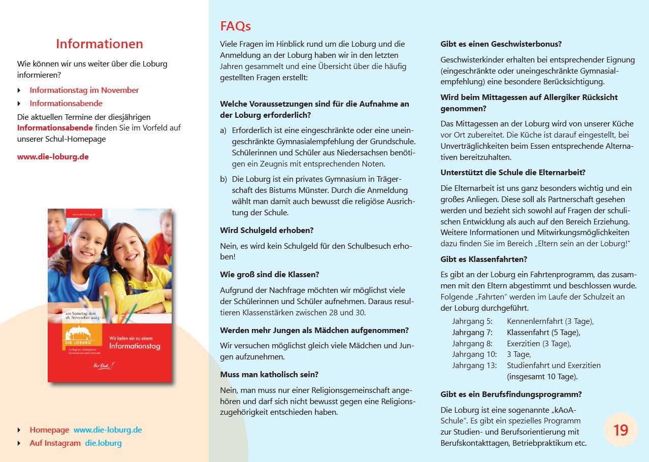 Zudem stehen Ihnen bereits jetzt digitale Informationsmöglichkeiten über das Gymnasium Johanneum und die Einschulung in die Klasse 5 auf unserer Homepage zur Verfügung, u.a. in der Einladung zum Informationstag ( Infobroschüre 2025) oder in unserer Broschüre „Willkommen an der Loburg!“. Aktuelle Aktivitäten der Loburg und aus dem Schulleben finden Sie darüber hinaus hier auf unserer Homepage oder auf Instagram unter „die.loburg“.
