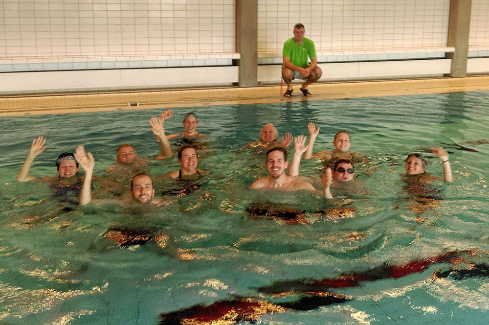 Zunächst erläuterte der Referent in einem Theorieblock den neuen Erlass zur Sicherheitsförderung im Schulsport anhand vieler Beispiele aus dem schulischen Alltag. Danach ging es im praktischen Teil ins Wasser. Hier mussten alle Teilnehmer ihre Rettungsfähigkeit unter Beweis stellen. Dies haben alle mit Bravour bestanden. In vier Jahren folgt der nächste Auffrischungskurs. Vielleicht kommt David Hasselhoff ja dann?!