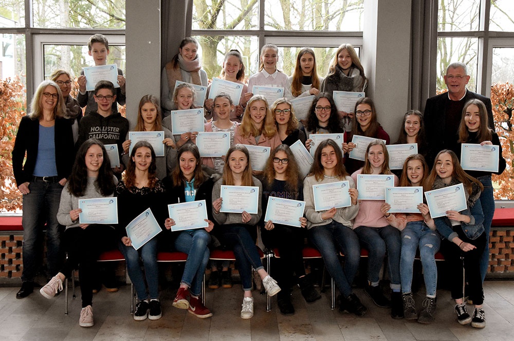 Bereits im Juni letzten Jahres haben 34 Loburgerinnen und Loburger erfolgreich die schriftlichen und mündlichen Prüfungen für das französische Sprachenzertifikat DELF abgelegt, und zwar in allen Niveaus von A1-B2. Bis zum Eintreffen der offiziellen Urkunden mussten sie sich lange gedulden, aber das Warten hat sich gelohnt: Am Donnerstag wurden ihnen die Zertifikate feierlich von Michael Bertels überreicht, zusammen mit einem Delfin-Anstecker in Bronze, Silber, Gold oder Emaille – je nach erreichter Niveaustufe.