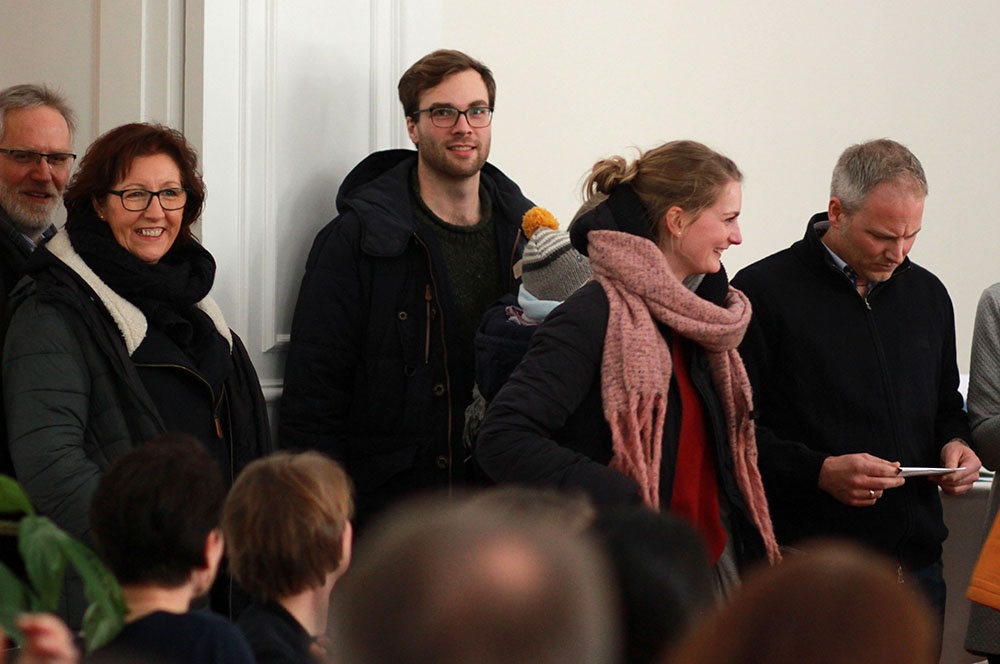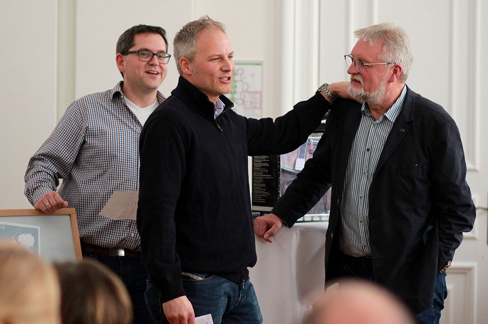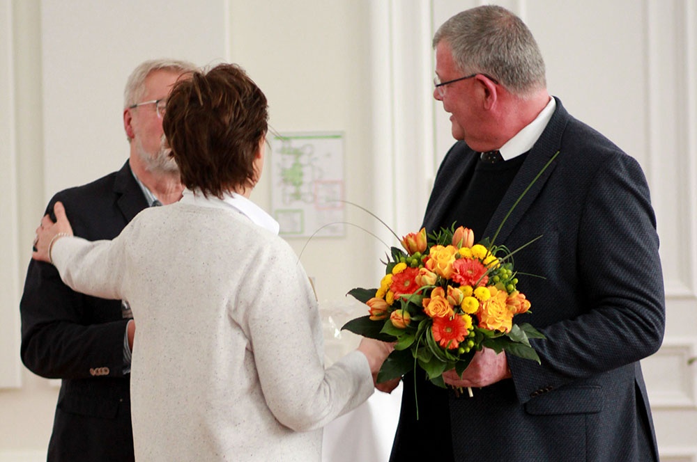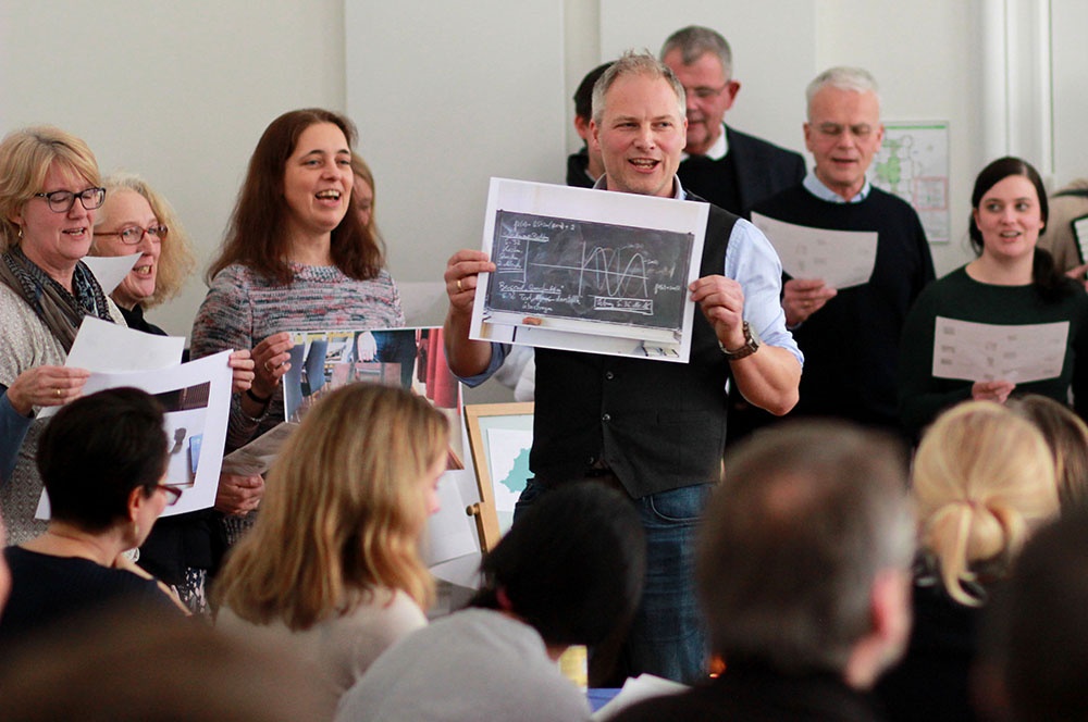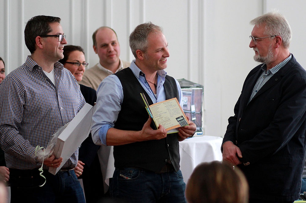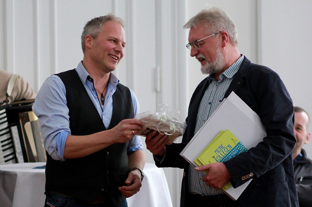 Zunächst aber wurde der Pensionär von der Schulleitung und den Kolleginnen und Kollegen geehrt. Michael Bertels verwies auf viele Aufgaben, die er im Laufe seiner Loburger Zeit kompetent wahrgenommen hatte, z.B. die Betreuung des Medienraumes in den Anfangsjahren der Digitalisierung. Heiter wurde es, als die Fachschaften Erdkunde und Mathematik sich verabschiedeten. Hans-Dieter musste an die Tafel. Der letzte Dinosaurier der Kreidedidaktik hatte Aufgaben aus seinen beiden Fächern zu lösen, was leidlich gelang. Anschließend trugen Anna Wehming, Dirk Folker und Patrick Thelen die Ergebnisse eines KollegInnen und SchülerInnen-Feedbacks über die Eigenschaften des Lehrers und Menschen Dieter Kampmann vor. Heraus kam das Bild eines immer souveränen, ausgleichenden und kompetenten Pädagogen, der Ruhepol und Freund für viele war. Besonders wurde sein Charme gewürdigt, der nie aufdringlich, sondern immer wertschätzend war. Die Stimmung erreichte den ersten Höhepunkt, als das Steigerlied – eine Reminiszenz an das Ende des Ibbenbürener Steinkohlebergbaus – erklang. Natürlich mit abgeändertem Text, in dem noch einmal die Eigenschaften und Eigenarten des scheidenden Kollegen gewürdigt wurden, die uns sehr fehlen werden.