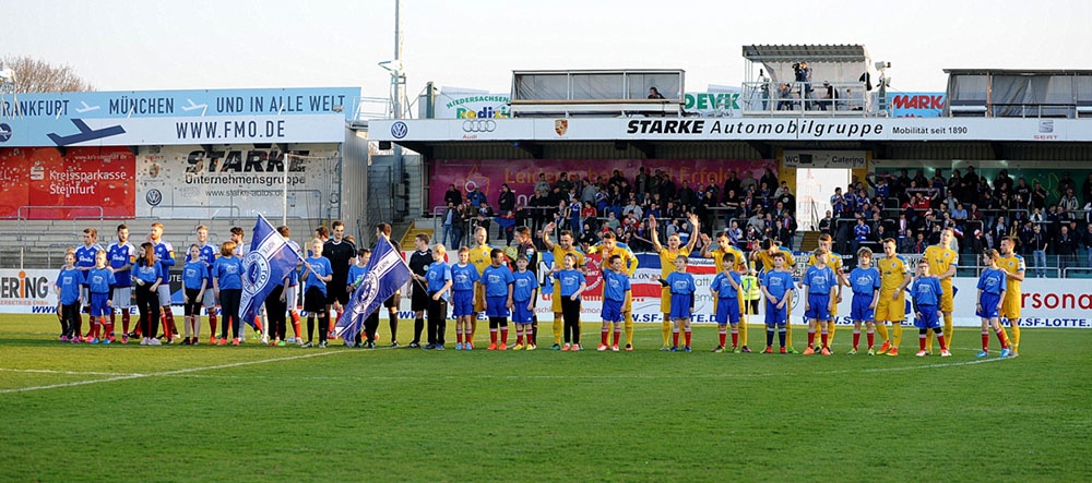 Nachdem die für den 11. Februar angesetzte Drittligapartie zwischen den Sportfreunden aus Lotte und Holstein Kiel aufgrund der schlechten Platzverhältnisse verschoben werden musste, konnten die Schülerinnen und Schüler der Klasse 6a am Morgen des 28. März 2017 aufatmen. Das Wetter hatte sich der Vorfreude angepasst.