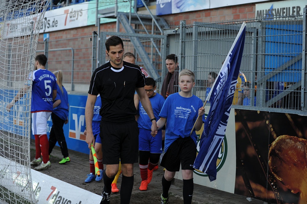 Während die Einlaufkinder über den Rasen geführt wurden, schmückten die übrigen Schülerinnen und Schüler ein mitgebrachtes Spannbettlaken mit einem persönlichen Gruß an die Spieler. Obwohl uns im Vorfeld das Einlaufen an den Händen der Lotter-Pokalhelden zugesichert wurde, fand sich die Mehrheit der Kinder dann doch an den Händen der Kieler Fußballprofis wieder, weshalb die zuvor zurechtgelegten aufmunternden Worte kurzerhand etwas neutraler übermittelt wurden. Nach einem kurzen Smalltalk war es endlich soweit!