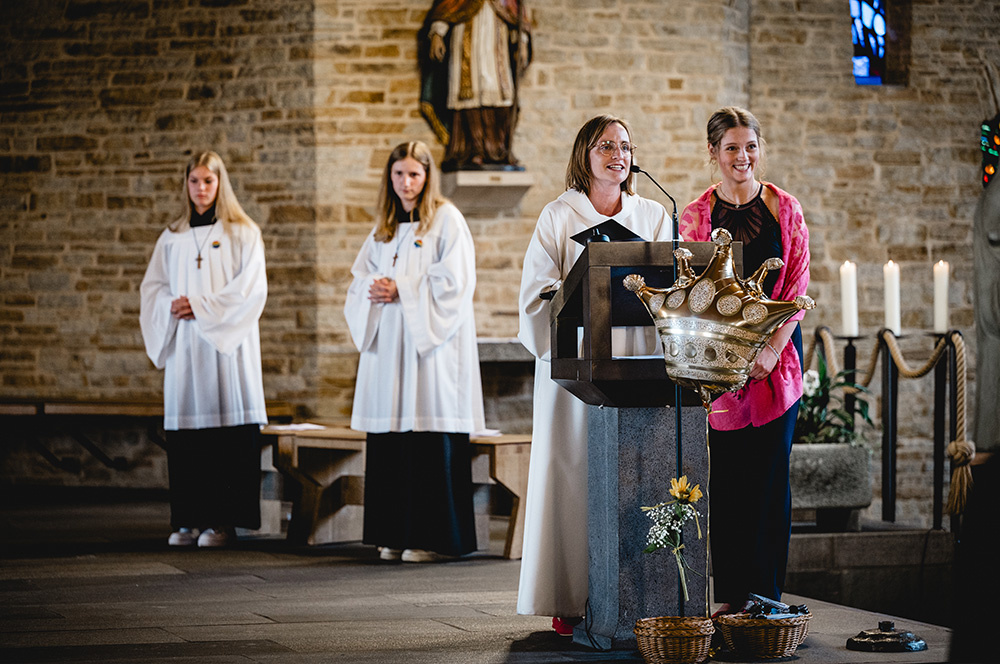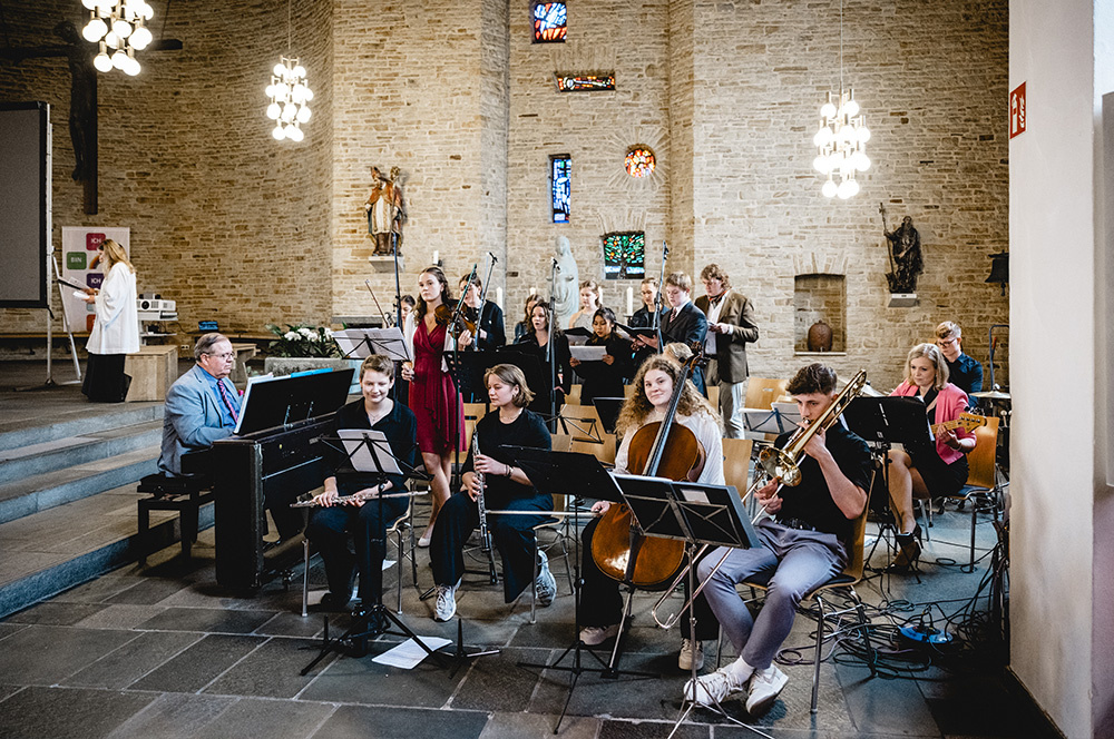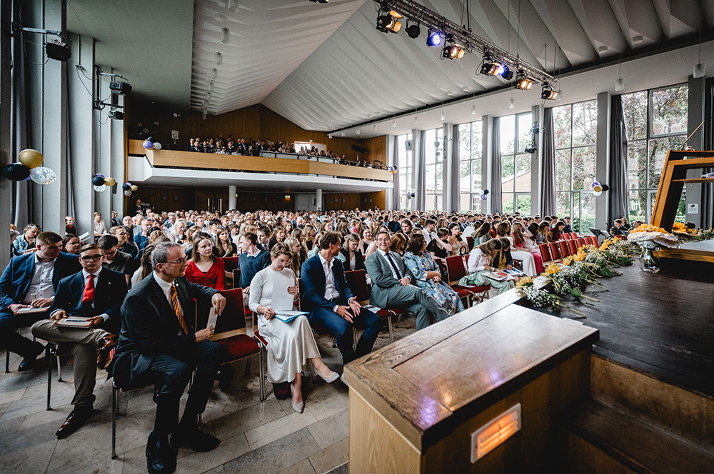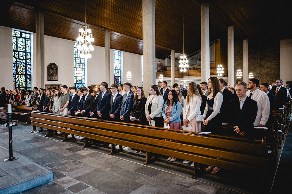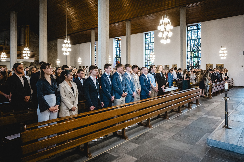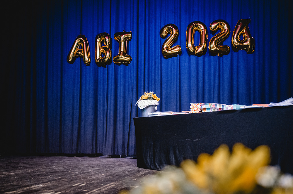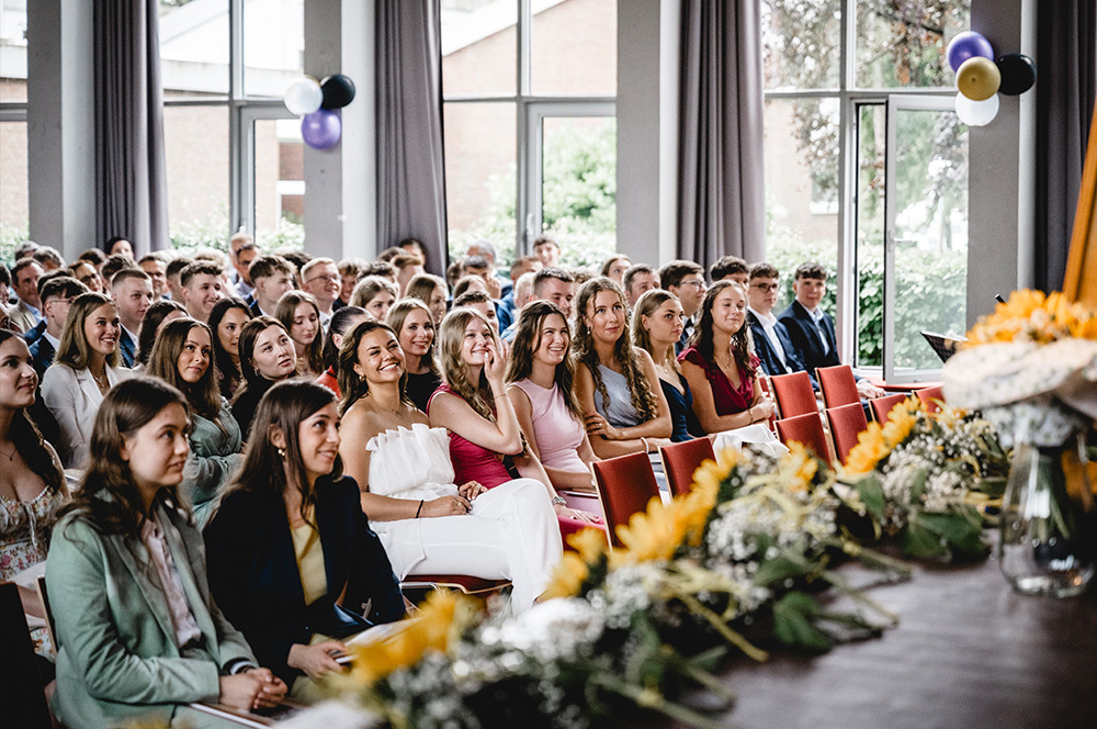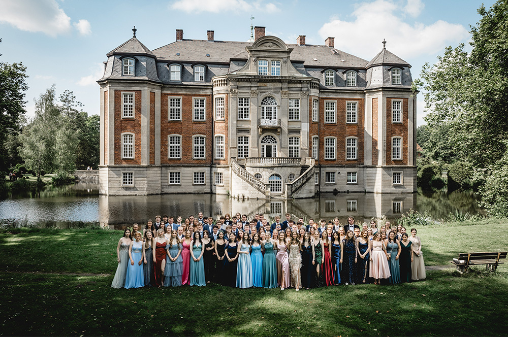 Der diesjährige Festakt zur offiziellen Entlassung der AbiturientInnen und feierlichen Zeugnisübergabe wurde in der Ambrosiuskirche eröffnet. Hier stand die Botschaft im Mittelpunkt, dass die jungen Menschen alle „Königskinder“ seien, ganz unabhängig von ihren Ergebnissen im Abitur oder anderen Faktoren. Das sich an den Gottesdienst anschließende offizielle Foto der Abiturientia musste in der Kirche gemacht werden, da ein heftiger Regenguss einsetzte, der auch den Ortwechsel in die Loburger Aula erschwerte.