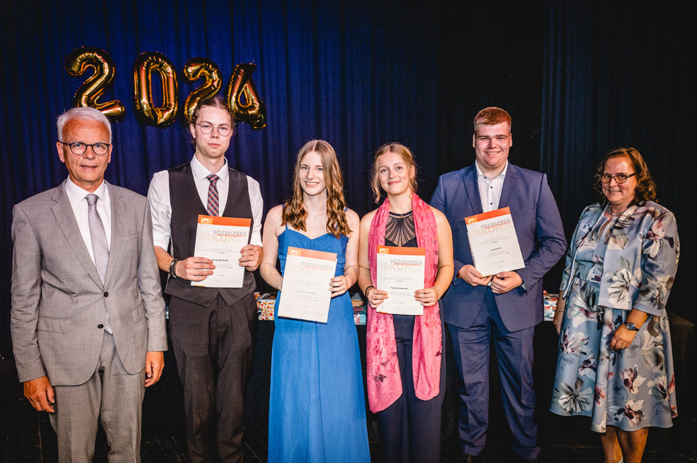 Anders als in den vergangenen Jahren wurde der Ehemaligenverein „Alte Loburger“ dieses Mal durch einen ehemaligen Lehrer vertreten, und zwar durch einen, der sich bei der Abiturientia und insgesamt an der Loburg großer Beliebtheit erfreut: Aloys Kleine Büning. Ihm kam die Ehre zu, den diesjährigen Sozialpreis zu überreichen. Geehrt für ihr ausgezeichnetes soziales Engagement wurden Pauline Wahlmeyer (Gottesdienstbegleitung, Musikalisches allgemein), Lea Kleine Wächter (Schülersprecherin), Bernd Westbrink (Schülersprecher) sowie Linus Kühne (SV-Arbeit und Schulsanitäter). Allen herzlichen Glückwunsch!