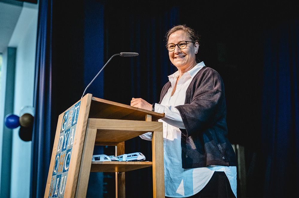 Hier eröffnete die Schulleiterin Dr. Anja Stiglic den Reigen der Redner, indem sie das Bild der Eisenbahn benutzte, um die Schullaufbahn und die Zukunft der AbiturientInnen zu illustrieren. Die Fahrt mit der Endstation Abitur habe angenehme Zwischenstopps wie Klassenfahrten oder -feste enthalten. Leider aber habe am Ende der Jahrgangsstufe 8 ein Sturm namens Corona die Gleise blockiert, sodass Schienenersatzverkehr eingerichtet worden sei. Auch Dank der kundigen Leitung der Koordinatoren Gilbert Tilke und Nico Hergemöller sowie der Stufenleiterin Elisabeth Menninghaus habe der Zug aber allen Widrigkeiten zum Trotz den Bahnhof erreicht, von dem aus nun eine Weiterfahrt in Interregios, Internationalen Zügen und vielem mehr möglich sei- die Welt stehe den jungen Menschen offen. Stiglic bedankte sich abschließend ausdrücklich bei allen BegleiterInnen der Fahrt und erhoffte sich für die AbiturientInnen viele wunderbare Begegnungen „im Zug des Lebens“.