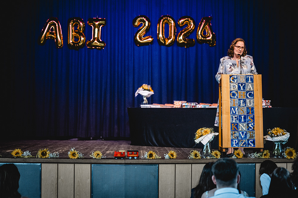 Als Vertreterin des Lehrerkollegiums sprach Nona Ahlers, die zunächst die Zutaten für eine gute Rede benannte, um selbige dann konsequent umzusetzen. Besonders amüsant für die SchülerInnen waren ihre humorvoll vorgetragenen anekdotischen Erinnerungen an Exkursionen, Exerzitien oder den ganz normalen Schulalltag. Es war zu spüren, dass die Stufe ihr am Herzen liegt.