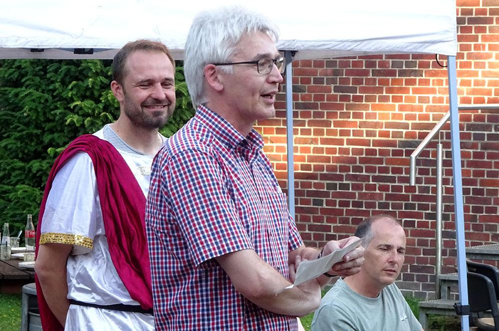Auch die Fachschaft Latein hatte sich zur Verabschiedung ihres langjährigen Fachvorsitzenden etwas einfallen lassen. Thorsten Wanke und Tobias Demmer brachten in spielerischer Form Wichtiges aus der Loburger Zeit von Ulrich Beuckmann zur Sprache. Vor einigen Tagen sei beim Legen neuer Kabel an der Loburg eine neue Version von Vergils Aeneis gefunden worden – Thorsten Wanke und Tobias Demmer übernahmen nun die Rollen von Aeneas und Anchises und zitierten aus der sogenannten „Heldenschau“, im Versmaß des Hexameter, allerdings mit Rücksicht auf die Zuhörer/innen in deutscher und nicht in lateinischer Sprache. Erwähnt wurden nun die „Heldentaten“ des Dr. Ulrich Beuckmann – u. a. die hohe Zahl der Korrekturen, die er jahrelang zu bewältigen hatte, die Kurstreffen mit den Leistungskursschülern, an die beide ebenso persönliche Erinnerungen hatten wie an die bereits erwähnten Romfahrten. Zuletzt bedankte sich Josef Bisping mit einigen Worten im Namen der Fachschaft noch einmal für alles, was Ulrich Beuckmann in den letzten Jahrzehnten geleistet hatte. Als Geschenk überreichte die Fachschaft ihm ein neues Trikot für seine zweite Leidenschaft, das Radrennfahren.