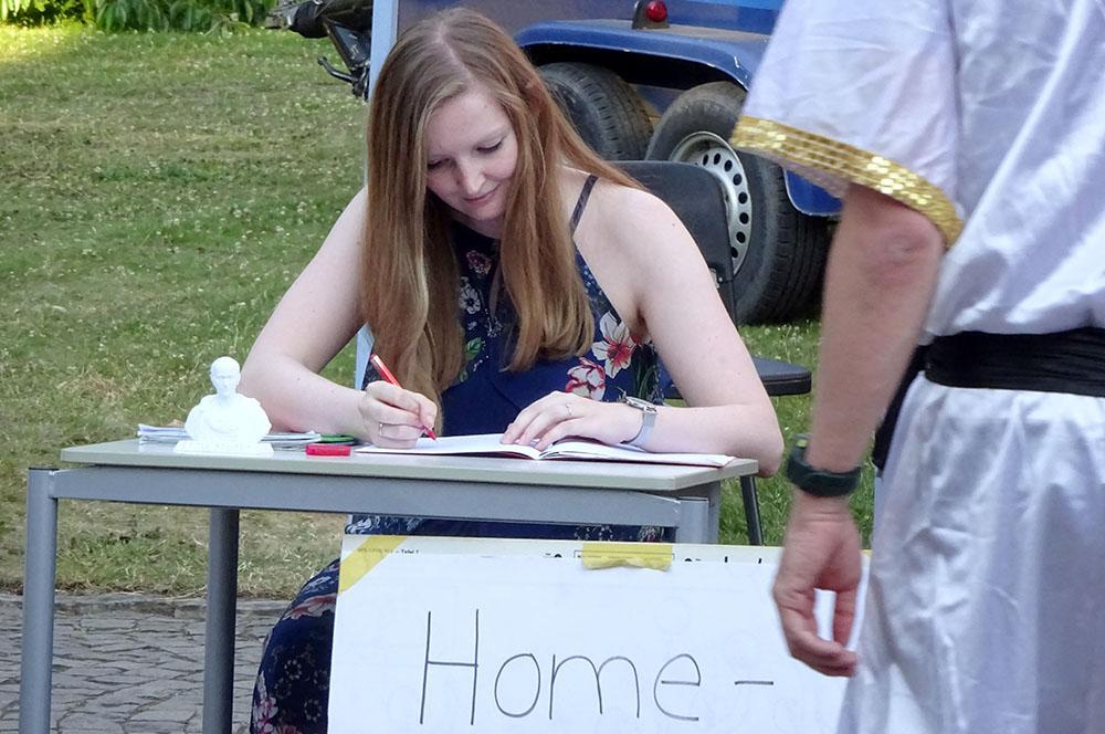 Die Anerkennung, die Ulrich Beuckmann bei den Schülerinnen und Schülern genoss, war auch am Freitag in der ersten Stunde in der Aula erkennbar. Die Kurse, die Ulrich Beuckmann zuletzt noch unterrichtet hat, überreichten ihm hier persönliche Geschenke und Dankeskarten – z. T. in lateinischer Sprache. Der Q1-Kurs, der in diesem Schuljahr von den Kolleginnen Jessica Kochsiek und Lisa Brumberg unterrichtet wurde, hatte noch für alle Anwesenden ein Quiz mit Fragen zum Fach Latein und zum Leben von Ulrich Beuckmann vorbereitet. Der an Ulrich Beuckmann verliehene Preis: eine Einladung zu einem Pizzaessen in einem römischen Restaurant. Der Kurs will in den Herbstferien nach Rom fahren …