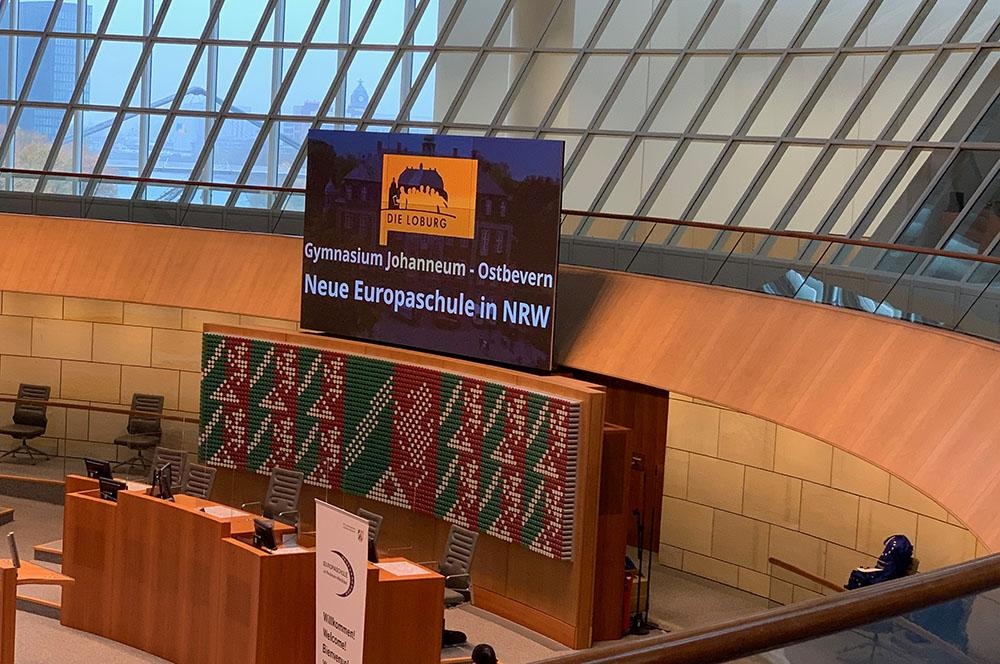 Anlässlich der 11. Jahrestagung der Europaschulen in NRW, wurden am Freitag, 19.11., im Landtag in Düsseldorf nicht nur die 7 neuen Europaschulen 2021 zertifiziert, sondern es fand gleichzeitig eine nachträgliche Ehrung der im Jahr 2020 zertifizierten Schulen statt, zu denen auch die Loburg zählt.