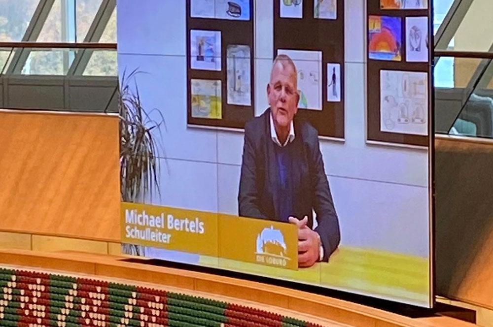 Aufgrund der Situation im letzten Jahr konnte leider keine offizielle Ernennung im Landtag stattfinden, so dass das Schulministerium diese Schulen nun am Freitag offiziell mit Hilfe der von den Schulen eingesandten Filmen vorgestellt hat. Die anwesenden Schülerinnen und Schüler der SV, Lehrerinnen und Lehrer sowie die Vertreterin der Elternschaft waren stolz, unsere Schule, Herrn Bertels und viele Loburgerinnen und Loburger auf der großen Leinwand im Plenarsaal des Landtages zu sehen.