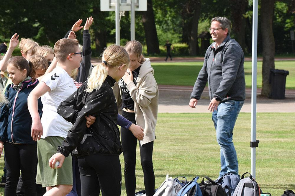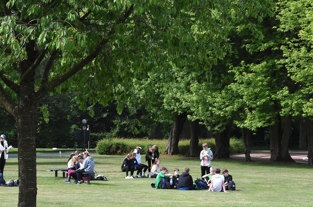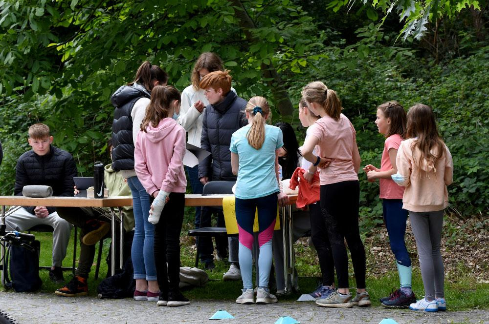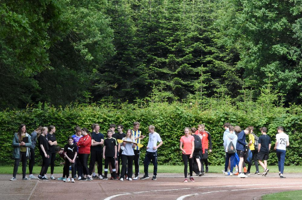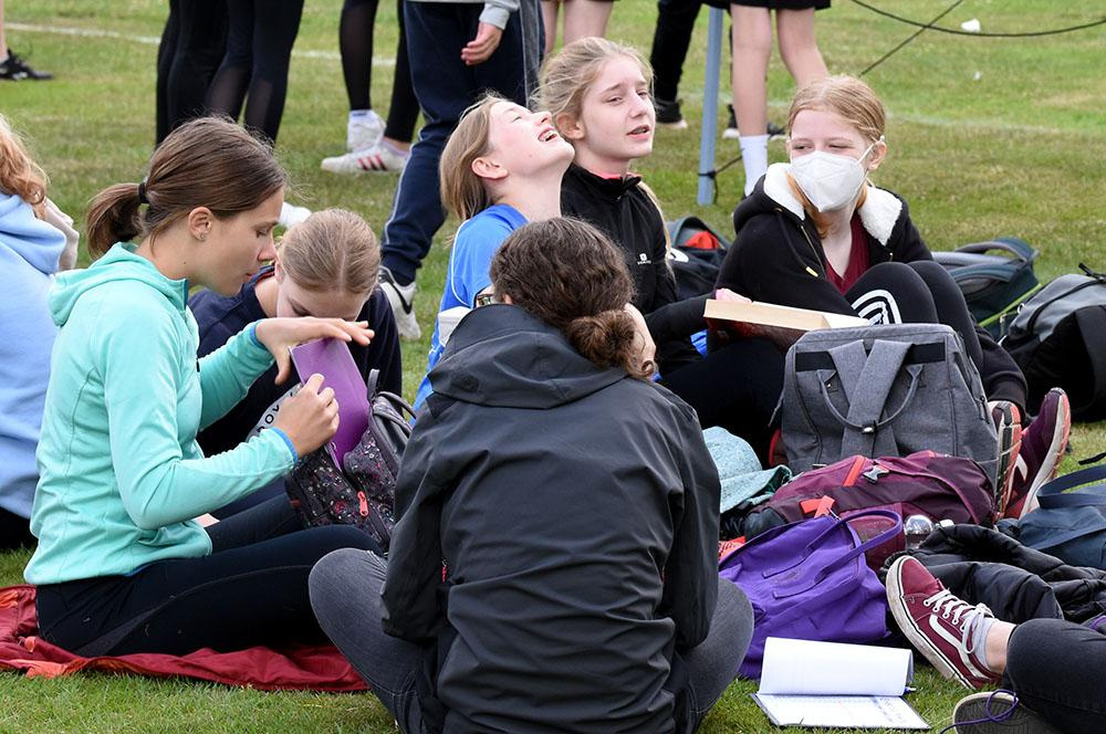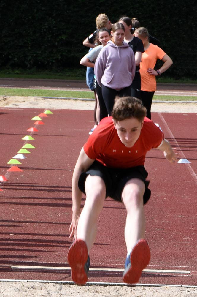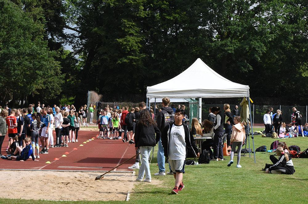 Auftakt eines sportlichen Tages bildeten die vier Disziplinen Weitsprung, Sprint, Langlauf und Wurf, die die Jahrgangsstufen 5 bis 9 im Klassenverband absolvierten. Unterstützt und motiviert durch die Schüler:innen der Jahrgangsstufe Q1 gaben die Mädchen und Jungen ihr Bestes. Unter all den starken Ergebnissen konnten sich diesmal besonders Max aus der 9d mit 1500 Punkten (und dem Tagesrekord von 12,5 sec. im 100m-Sprint) sowie Alissa aus der 9c mit 1427 Punkten (und dem Tagesrekord von 2:51 sec. auf 800m) auszeichnen. Aber wie erfolgreich auch immer: Letztlich ist das Dabeisein alles, denn es kommt auf den Spaß an der Sache und das Gemeinschaftserlebnis an.