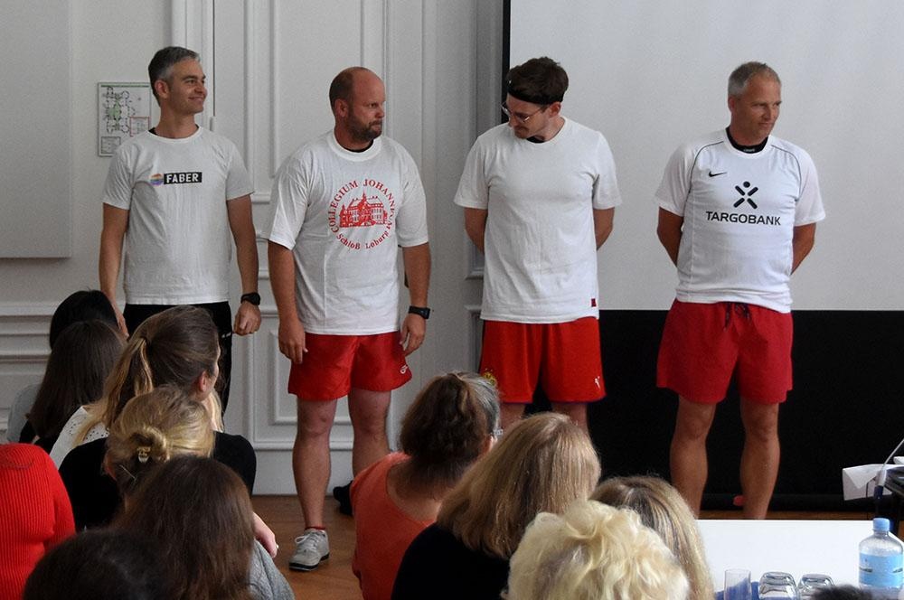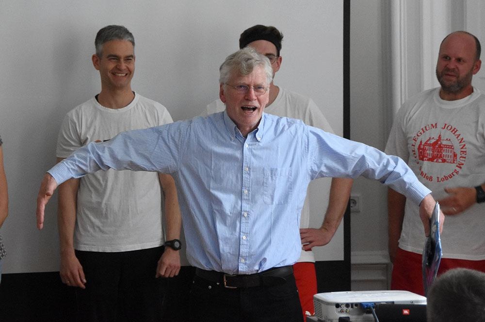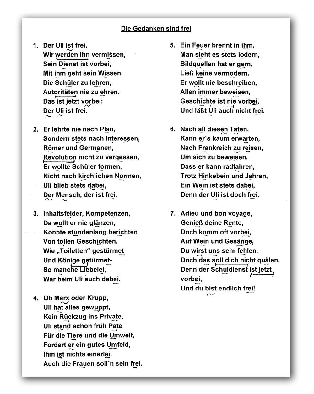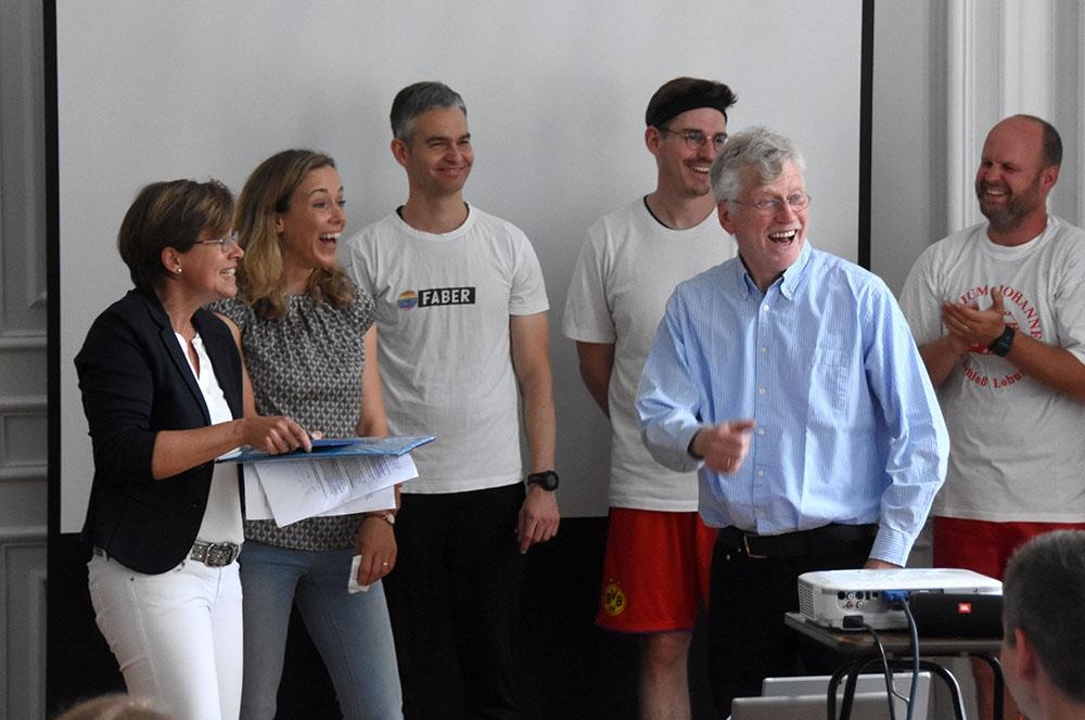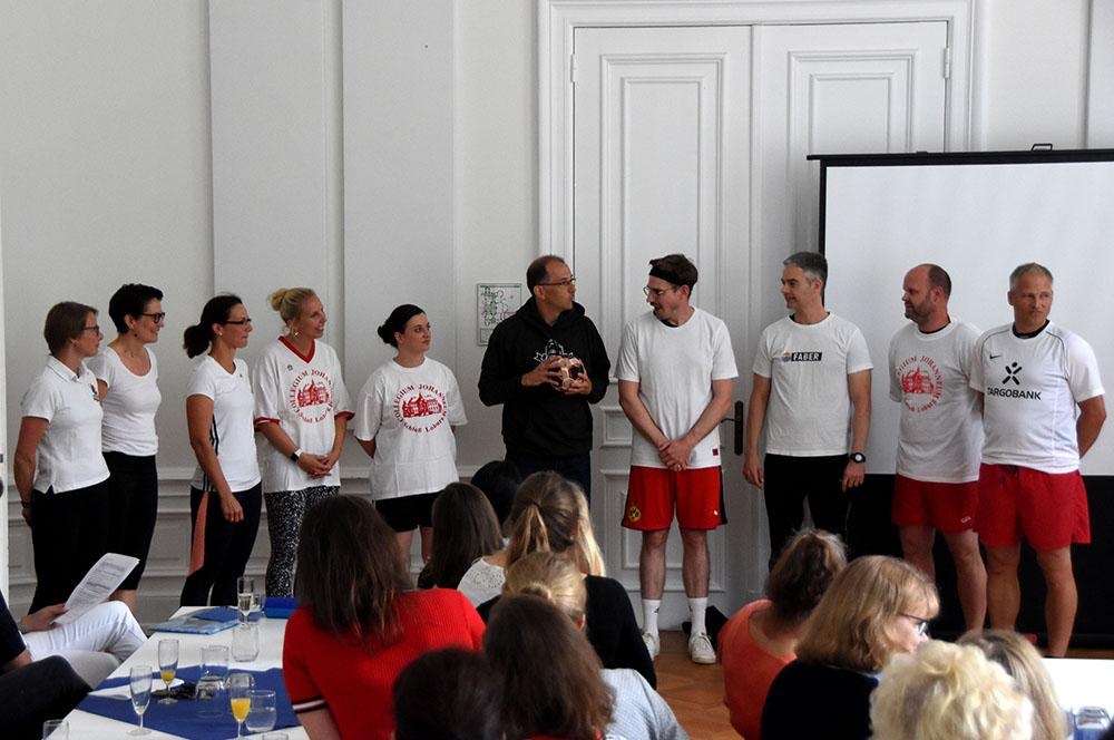 Die Fachschaft Sport spielte zunächst die Geschichte des Faches auf der Loburg vor und würdigte dadurch die Rolle, die Ulli bei der Entwicklung eines modernen Sportunterrichts und bei der Integration der Mädchen hatte. Die Historiker bedankten sich mit einem selbst verfassten Lied und betonten wie leidenschaftlich Ulli den SchülerInnen immer wieder Geschichten aus der Geschichte erzählt hat und mit welchem Einsatz er Freiheit und Demokratie vermittelt hat: