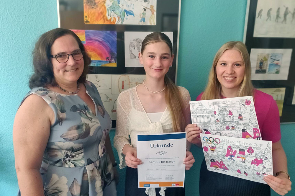 Helene Holtmann, eine Schülerin der 8b, hat beim deutschlandweiten Schulcomic-Wettbewerb „La vie en BD“ mit ihrem kreativen Beitrag beeindruckt. Der Wettbewerb, der im Schuljahr 2023/24 stattfand, hatte das Thema „Paris 2024: Des Jeux pour tous / Spiele für alle“ und zog nahezu 500 Teilnehmerinnen und Teilnehmer aus den Klassen 7 bis 10 an.