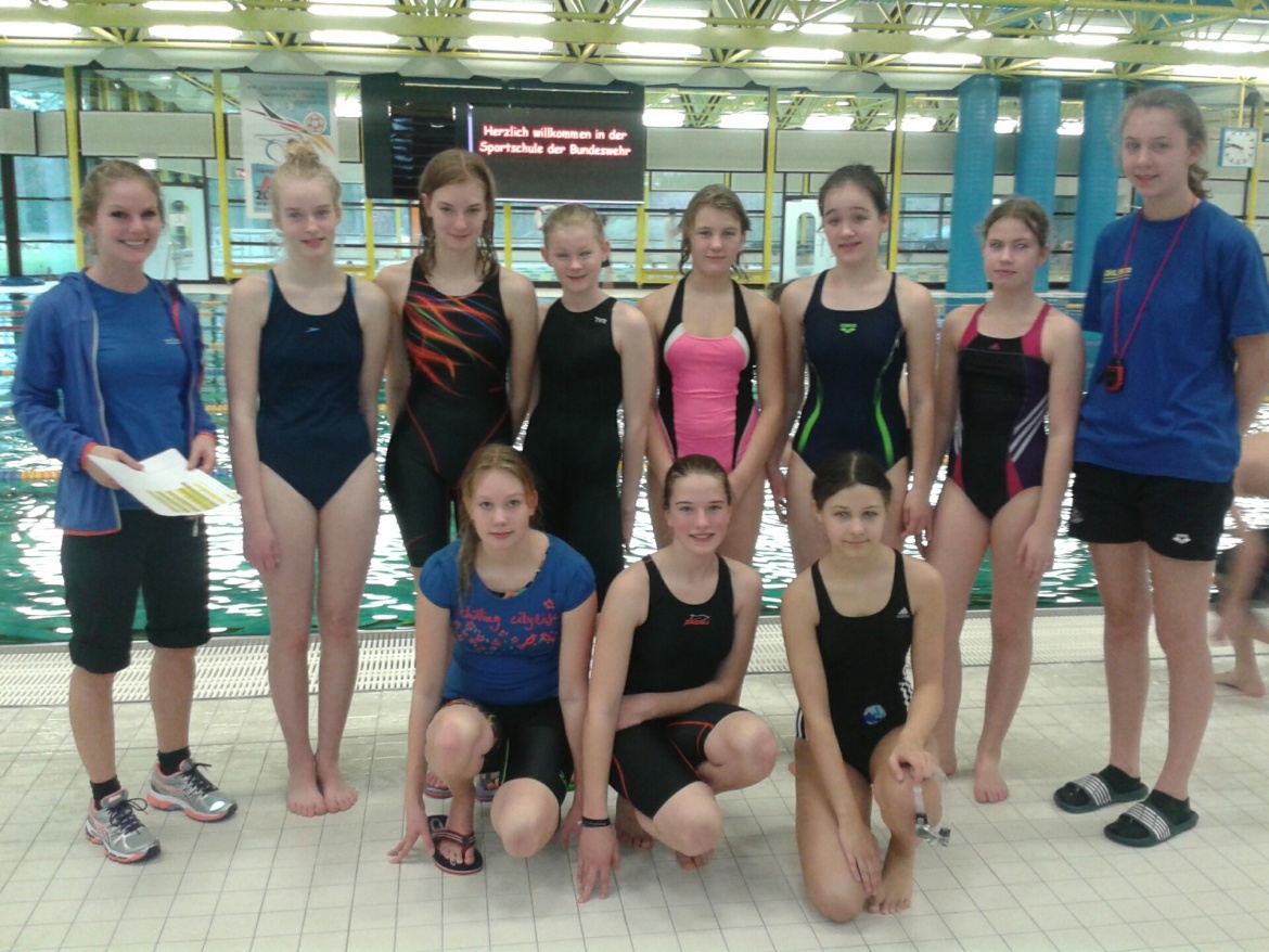 Die Namen der Schwimmerinnen lauten: Lina Hagedorn, Marie Drücker, Christin Gädker, Anna Drücker, Celine Steinebel, Pia Hildebrand, Henrike Riese, Laura Schlautmann, Merle Bruns.