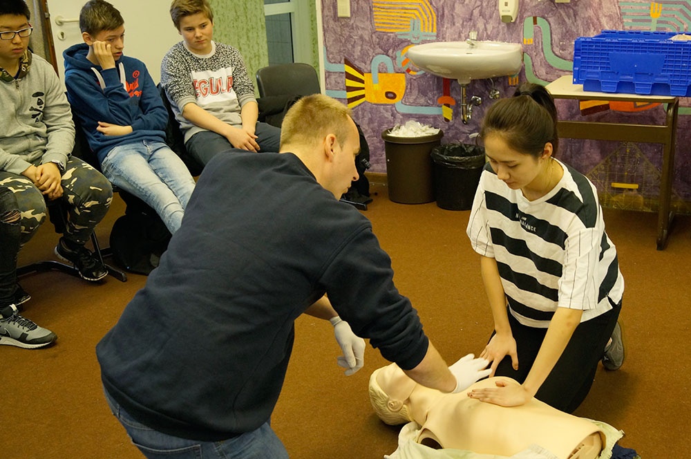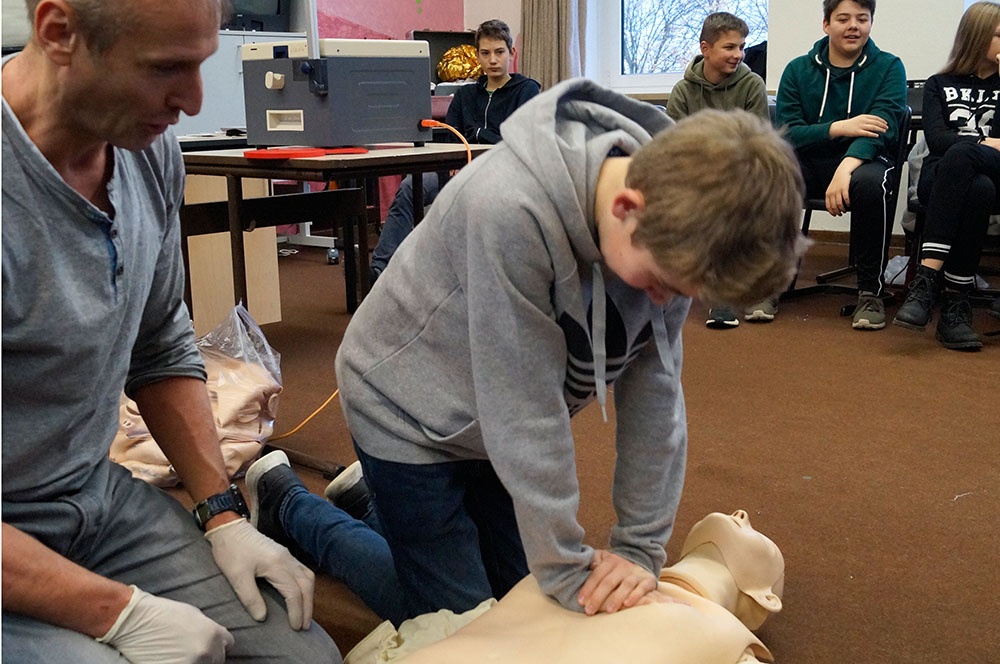 Im Erste-Hilfe-Kurs der Malteser sind den SchülerInnen lebensrettende Sofortmaßnahmen wie z.B. die Herzdruckmassage, Herzlungenwiederbelebung oder stabile Seitenlage nicht nur erklärt worden, sondern wurden auch praktisch eingeübt. So weiß nun jeder, wie er sich als ErsthelferIn im Ernstfall verhalten muss. Die Angst, dass man bei dem Versuch 1. Hilfe zu leisten etwas falsch machen könnte, ist den SuS dadurch genommen worden.