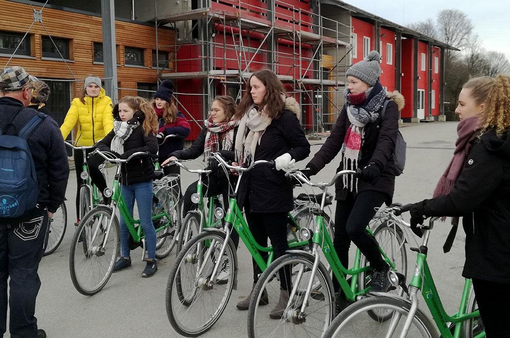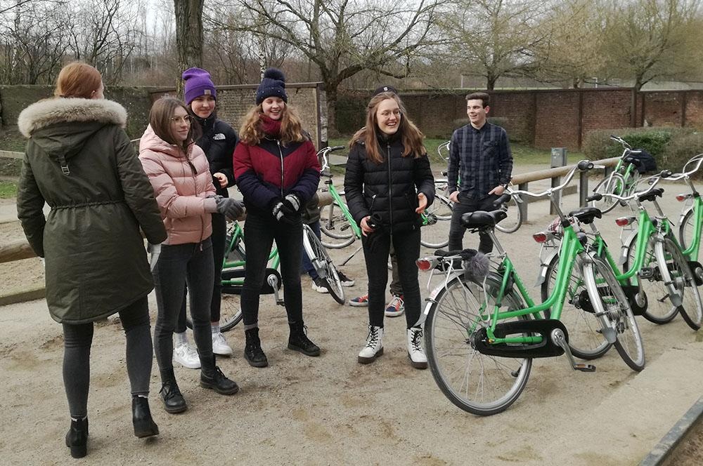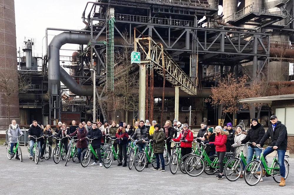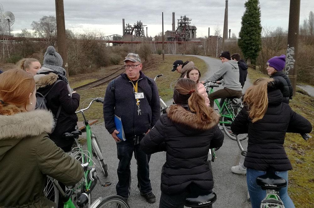 Nachmittags führte uns die Exkursion zum Industrie- und Landschaftspark Duisburg Nord, wo die Schüler das alte Industriegelände im Rahmen einer Fahrradtour erkundeten. Wir „erfuhren“ viel über die Bedeutung der komplexen Industrieanlagen früher und die Menschen, die vom Bergbau und der Stahlverarbeitung lebten. Die heutige Nutzung überraschte die Teilnehmer an vielen Stellen, da sich die alten Gebäude und Lagerstätten nicht nur als Filmkulisse, Open-Air-Kino, Skaterpark, Kletterparadies, Tauchgasometer und Lernbauernhof entpuppten, sondern die Freiflächen zwischen den Halden zu Naherholungsgebieten an der teils renaturierten Emscher umgewandelt worden sind und das trotz der Altlasten in Boden und Grundwasser.