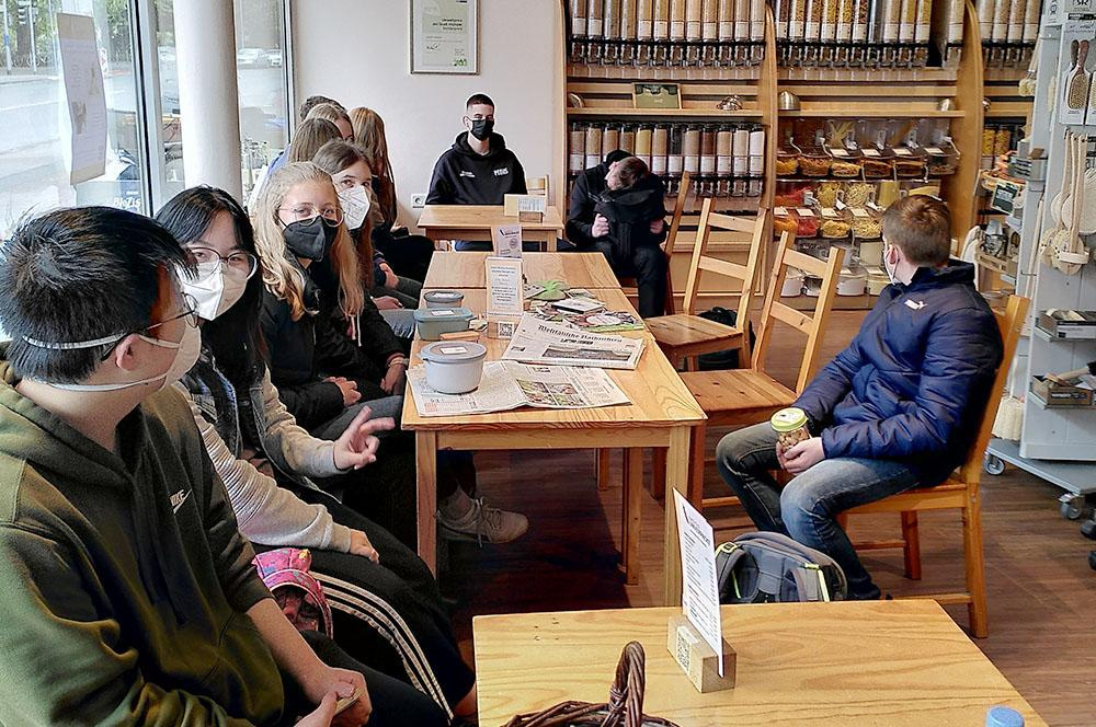 Am Montag, den 25.04.22 hat der NW A-Kurs des Jahrgangs 9 eine Exkursion zum Unverpackt-Laden nach Münster gemacht. Die Besitzerin des Ladens, Anja Minhorst, hat uns über ihre Beweggründe für die Eröffnung eines solchen Ladens in Münster und das Konzept des Ladens berichtet. Die Kunden bringen ihre eigenen Behältnisse mit, in die sie die Lebensmittel in der gewünschten Menge abfüllen können. So kann sehr viel Verpackungsmüll eingespart werden. Die Schülerinnen und Schüler durften auch das Vorratslager anschauen. Die Lebensmittel werden meist in Papiersäcken oder mehrfachverwendbaren Dosen geliefert.