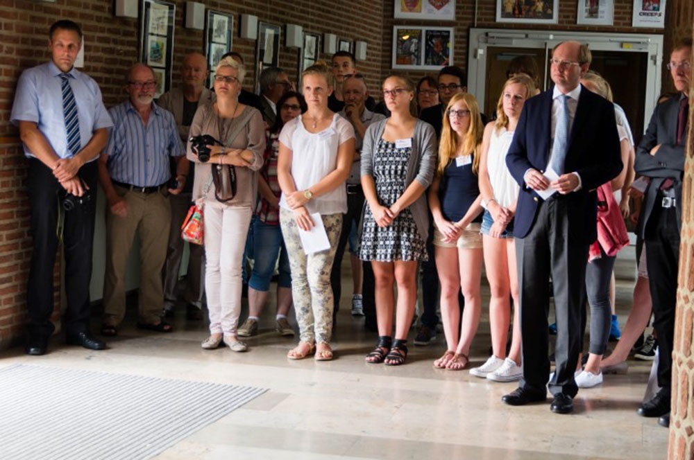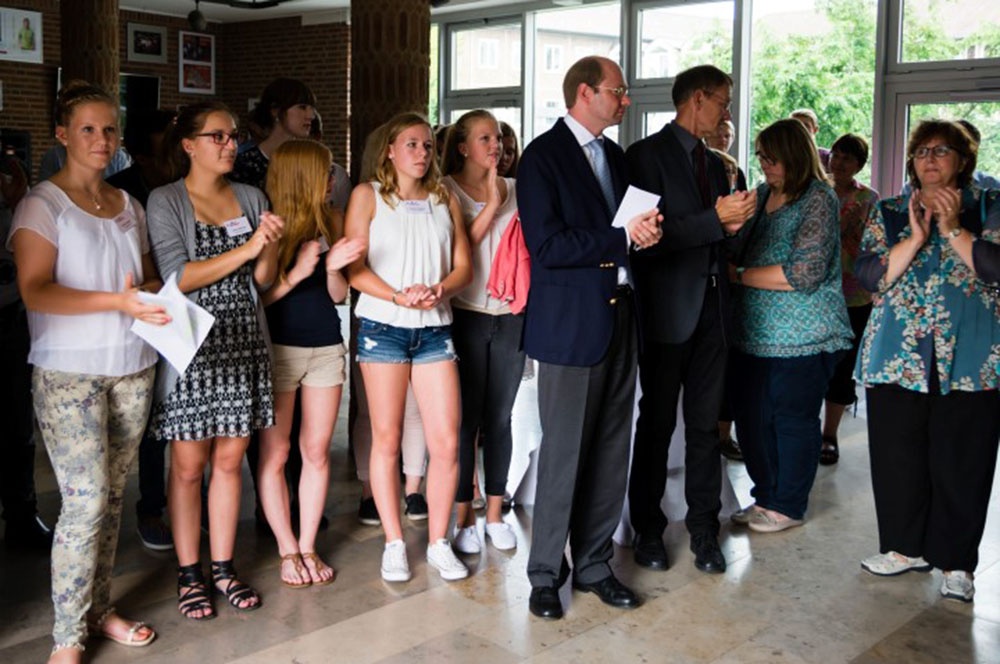 Nach den Begrüßungsreden des Schulleiters Herrn Bertels, des Landrates Dr. Gericke, des Bürgermeisters von Ostbevern, Herrn Annen und des Direktors des Anne Frank Zentrums in Berlin, Herrn Siegele kamen auch die eigentlichen Hauptakteure der Ausstellung zu Wort, die Peer Guides. Für die 28 Schüler der Josef Annegarn Schule und der Loburg, die in den nächsten vier Wochen 40 Schulklassen des ganzen Kreises durch die Ausstellung führen, sprachen Hannah Engels und Lotta Haverkamp. Nicht zu vergessen natürlich der Leiter des Jugendzentrums, Herr Rainer Uthmann, der die Ausstellung überhaupt erst nach Ostbevern geholt hat. Zeitgleich läuft diese Ausstellung übrigens auch noch in den weniger bekannten Städten New York, Vancouver und London.