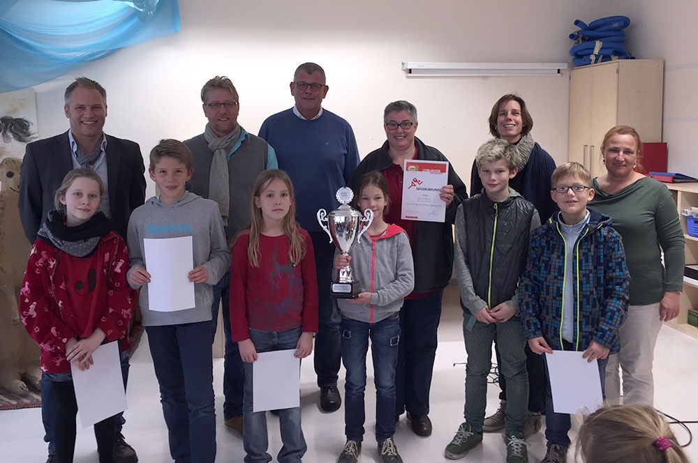 Schulleiter Michael Bertels und Chef-Organisator Patrik Thelen waren am letzten Donnerstag nach Warendorf gereist, um den Schülerinnen und Schülern der Josefschule Warendorf ganz offiziell den Siegerpokal für den Gewinn des diesjährigen Loburger Waldlaufs zu überreichen.
