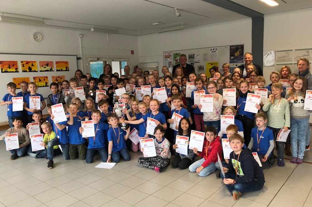 In einer kleinen Feierstunde mit allen Schülerinnen und Schülern der Schule würdigten die beiden insbesondere die hervorragende Teamleistung aller Läuferinnen und Läufer, durch die dieser tolle Erfolg erst möglich geworden sei. Stellvertretend nahmen die Klassensprecher der vier Klassen des 4.Jahrgangs den großen Wanderpokal und Andrea Winter als Schulleiterin die Siegerurkunde der Schule für den Gesamtsieg beim diesjährigen Waldlauf entgegen. Für die Ambrosiusschule war es der erste Erfolg beim Waldlauf seit 24 Jahren! 1994 (!) konnte die Schule letztmalig den Wanderpokal gewinnen. Alle 93 Schülerinnen und Schüler der 4.Klassen erhielten darüber hinaus im Anschluss jeweils eine Siegerurkunde und eine Medaille für ihre tolle Leistung.