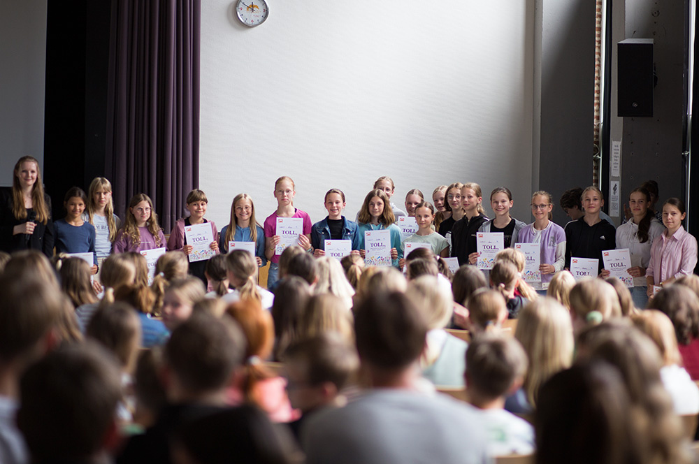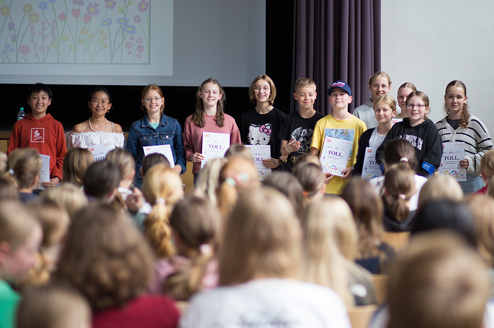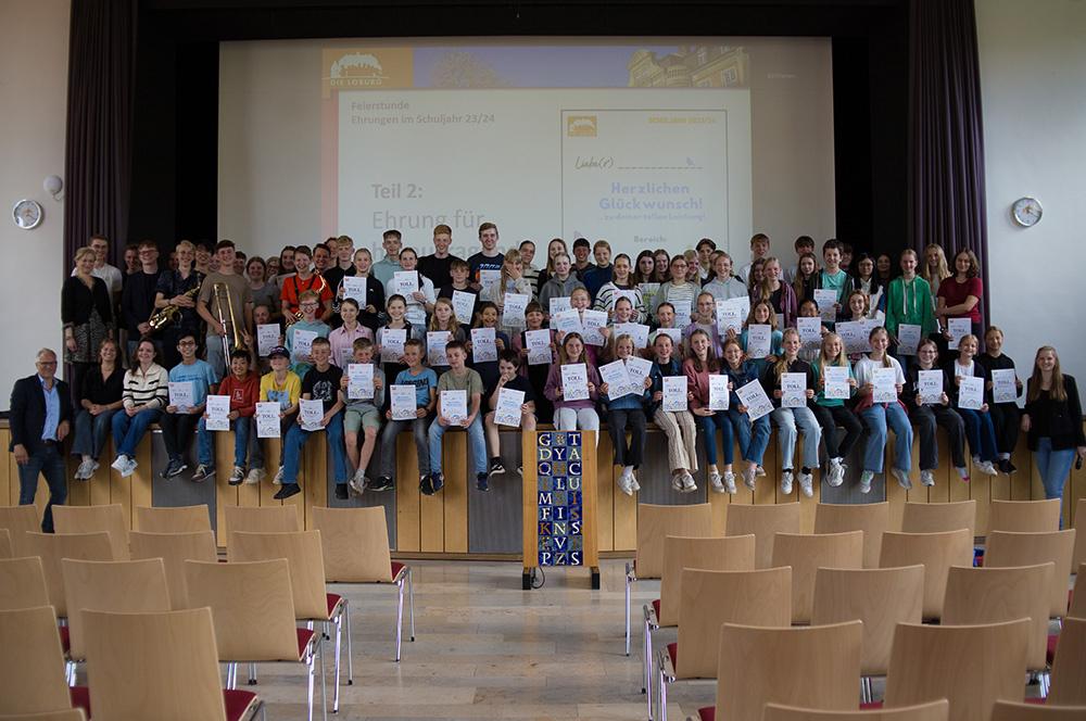 Zu Beginn der letzten Schulwoche fand an der Loburg eine kleine Feierstunde zur Ehrung von Schülerinnen und Schülern statt, die sich durch besonderes Engagement oder durch besondere schulische Leistungen ausgezeichnet haben. Die Idee zu Feierstunde entstand im Arbeitskreis Mittelstufe im Rahmen der Überlegungen zu unserem Leitsatz “Gemeinschaft”, der im Schuljahr 23/24 im Fokus stand. Die Feierstunde wurde nun zum ersten Mal umgesetzt, wobei die Kategorien, was und damit auch wer ausgezeichnet werden sollte, von Kolleginnen und Kollegen vorgegeben wurde. Als Publikum waren die Jahrgangsstufen 5 und 6 geladen, der Kreis der geehrten Schülerinnen und Schüler erstreckte sich von der Klasse 5 bis zur Q2.