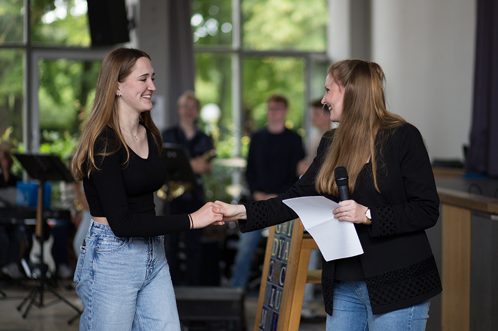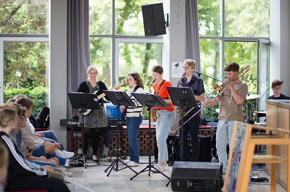 Den richtigen Ton setzte die Abi-Band 25, die der Veranstaltung den musikalischen Rahmen verlieh. Nach einer Begrüßung durch Frau Dr. Stiglic führten Frau Kochsiek und Herr Thelen durch das Programm. Dabei konnten die Anwesenden erfahren, in welchen Bereichen man sich an der Loburg engagieren kann. Der musische Bereich ist durch verschiedene Ensembles breit aufgestellt – insbesondere die Tatsache, dass man mit musikalischen Darbietungen gute Stimmung verbreiten kann, motiviert die Aktiven hier. Engagieren können sich Schülerinnen und Schüler aber auch bei den Medienscouts, als Paten für die Klassen der Jahrgangsstufen 5 und 6 oder in der SV. Viel Zulauf erfahren zum Beispiel die Schulsanitäter, die es motiviert, wenn manchmal etwas Traubenzucker und ein offenes Ohr reichen, damit es Schülerinnen und Schülern wieder besser geht. Eine zentrale Rolle für sämtliche Veranstaltungen an der Loburg spielt ebenso die Aula-Technik, wo die alten Hasen der Q1 nun die nächste Generation von Technikern und Technikerinnen anlernen. Erfolge im Vorlesewettbewerb, beim Sport, bei den Fremdsprachen, in Geografie und Mathematik dokumentierten einen Ausschnitt der besonderen schulischen Leistungen, durch die sich Schülerinnen und Schüler auszeichneten. Im Anschluss an die Überreichung der Urkunden durften die Schülerinnen und Schüler der mitreißenden Jam Session der Abi-Band 25 lauschen und den ein oder anderen Muffin oder Brownie verspeisen, die dankenswerterweise von Eltern gespendet wurden.