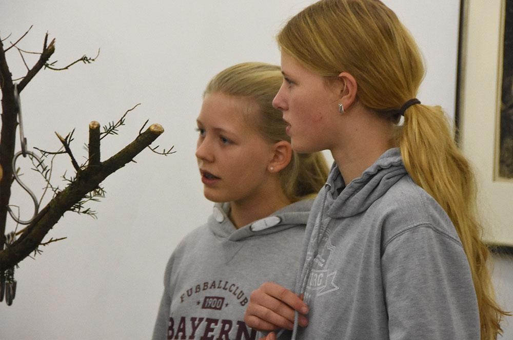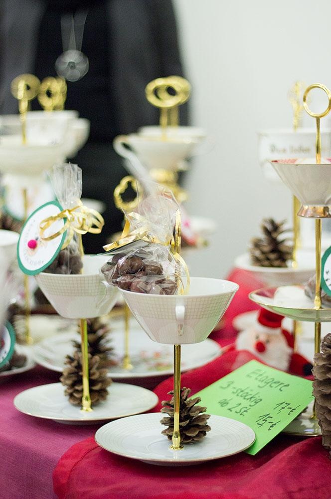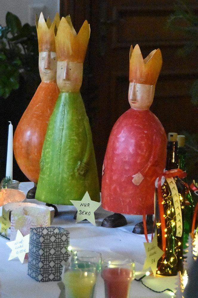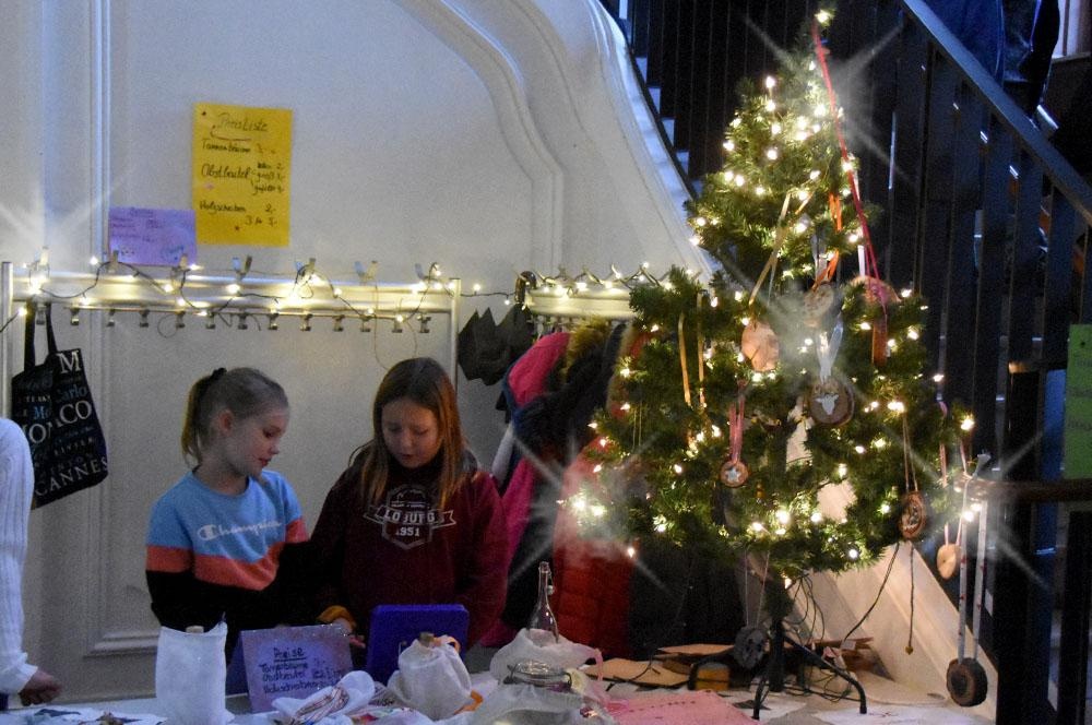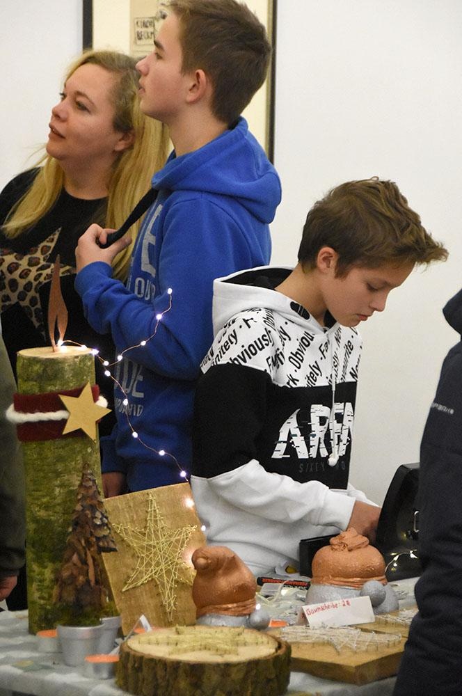 Zahlreiche Besucher schlenderten durch die einzelnen Räume und zeitweise wurde es auf der Treppe sogar recht eng. Da der Basar nicht nur zum Schauen anregen sollte, sondern auch zum Verkauf, fanden sich sehr phantasievolle Dekorations- und Geschenkartikel an den einzelnen Ständen: Dauerbrenner wie Tannendekorationen oder Weihnachtskarten, Windlichter, Futterhäuschen oder -teller oder leuchtende Sterne, die in Lasertechnik ausgesägt wurden, wechselten ebenso den Besitzer wie Laptop-Tabletts, Rindenbrettchen mit Figuren oder Rezeptbücher.