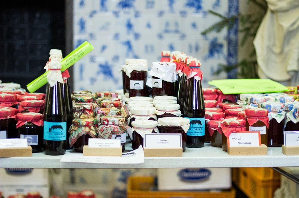 Auch für das leibliche Wohl war auf vielfältige Weise gesorgt: Im stimmungsvollen Ambiente der Cafeteria gab es leckere Torten und Kuchenstücke, während draußen vor dem Schloss in der Jurte heiße Getränke sowie Grillspezialitäten angeboten wurden. Für diejenigen, die auch zuhause die Loburg „genießen“ möchten, boten die Schwestern ihre ausgefallenen Marmeladenkompositionen wie auch die legendäre „Loburger schwarze Seele“, einen selbstgepressten Saft, an. Diejenigen, die sich die Höhepunkte des vergangenen Loburger Schuljahres nochmals in Erinnerung rufen wollten, konnten auch schon die druckfrische Jahresschrift erwerben.