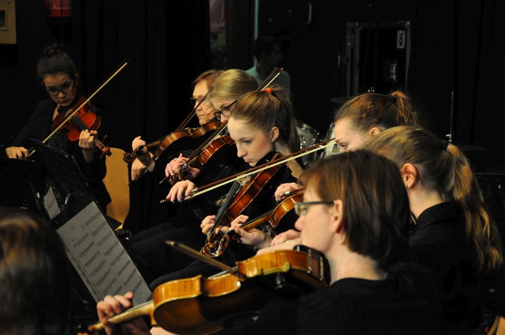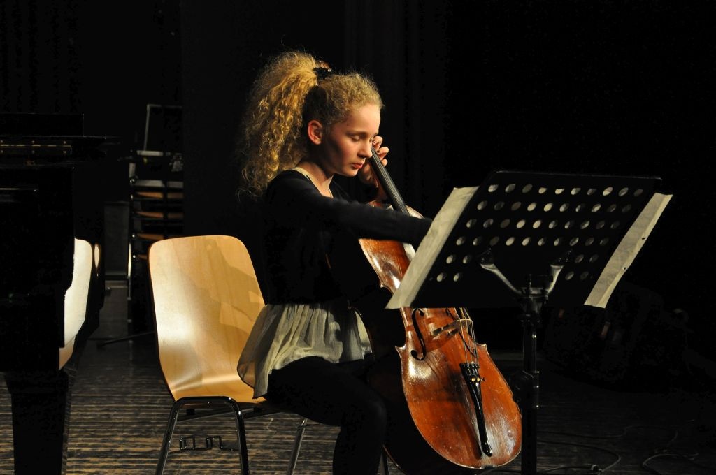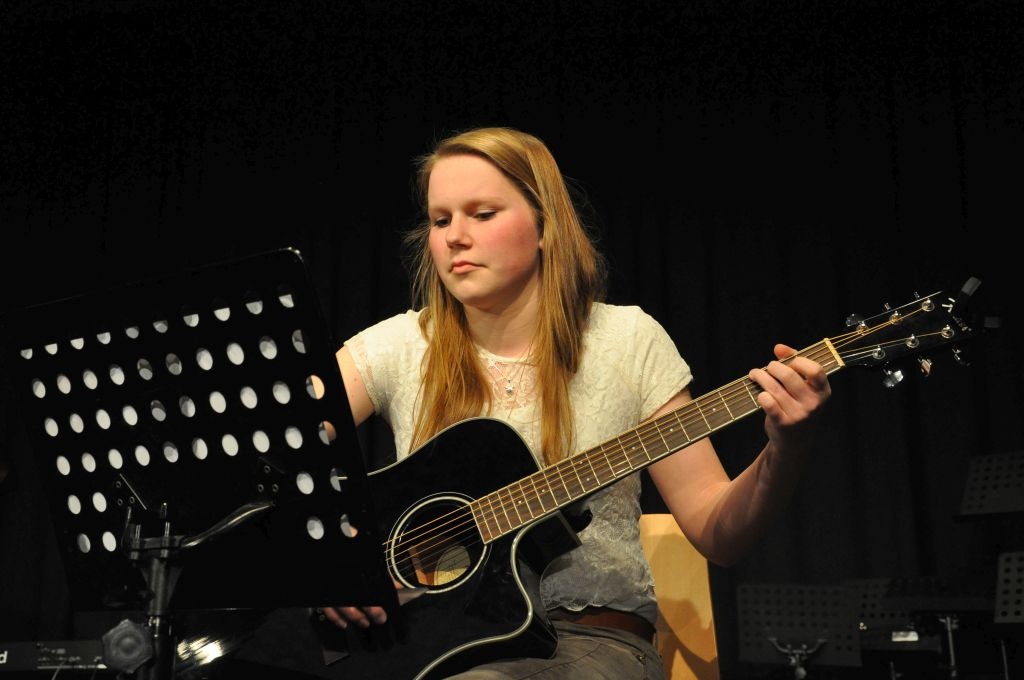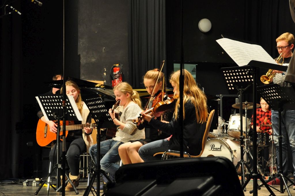 Anschließend wechselte das Programm wieder zum klassischen Fach: Die Schwestern Anna und Paulina Kolorz harmonierten am Klavier und Cello und blieben nach ihrem Vortrag gleich auf der Bühne, um beim anschließenden Auftritt des Kammerorchesters mitzuwirken. Unter der Leitung von Rainer Kunert entführte das Orchester die Zuschauer durch ein Medley aus dem Film „Pirates of the Caribbean“ in die Karibik. Anschließend wurde es politisch: Mit seinem Q2- Musikkurs hatte Matthias Hellmons zwei Protestsongs geschrieben und einstudiert, die die zukünftigen Abiturienten mit Videobegleitung zum Besten gaben. In ihrem ersten Lied kritisierten sie das Verhalten Russlands in der Ukrainekrise und damit zusammenhängend auch die Rolle der Medien, während sich das zweite Lied „Uncle Sam“ mit den USA und den Leidtragenden der Kriege im Nahen Osten beschäftigte.