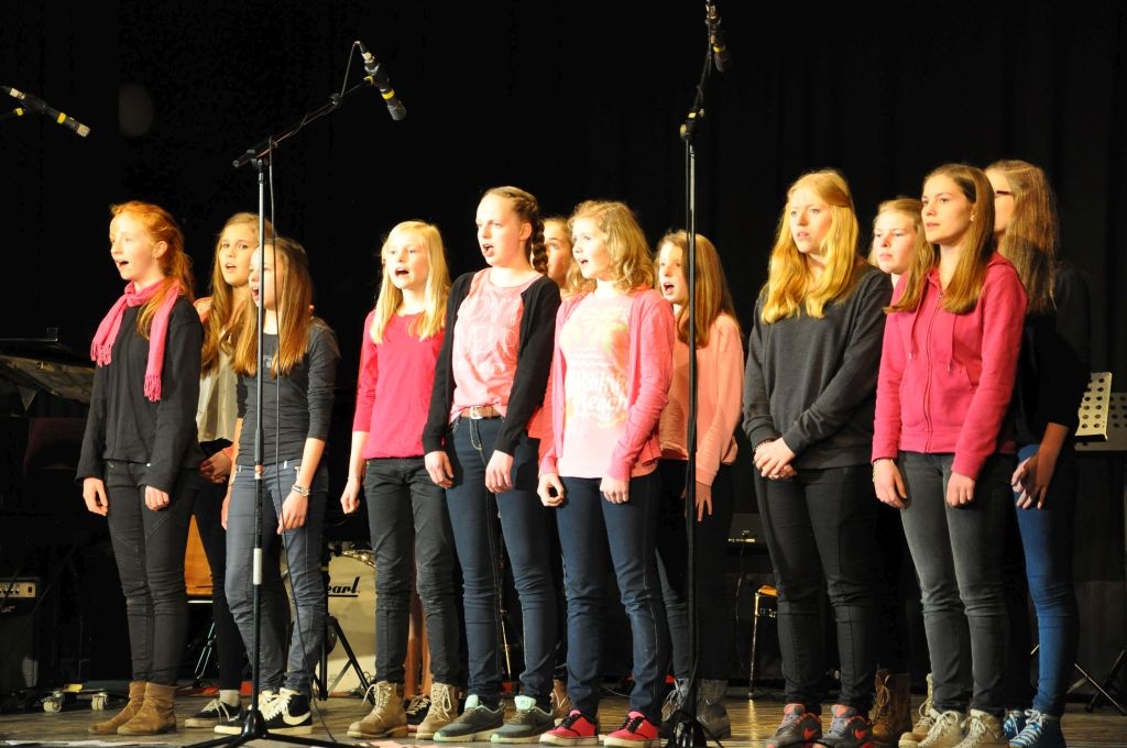 Es folgte das Ensemble Kunterbunt unter Jan-Dirk Frönd mit einer eigenen Interpretation des Sommerhits 2014, „Ein Hoch auf uns“, bevor die Sisters unter der Leitung von Ulrike Scheipers zunächst Paul Simons Klassiker „Sound of Silence“ und anschließend den Song „Cups“ auf die Bühne brachten, den Franziska Seidel gekonnt auf einer Conga begleitete.