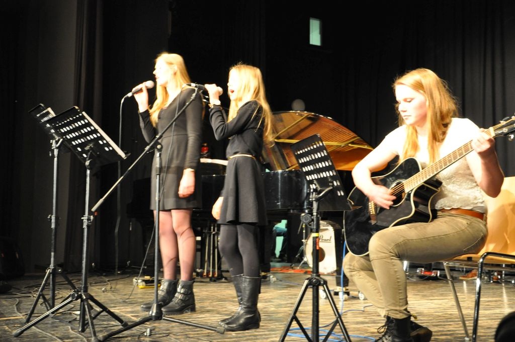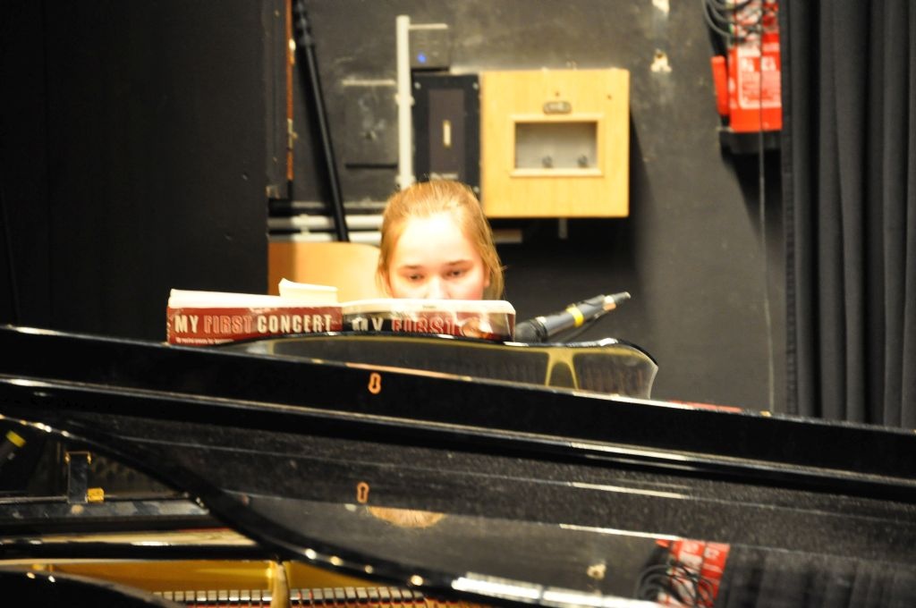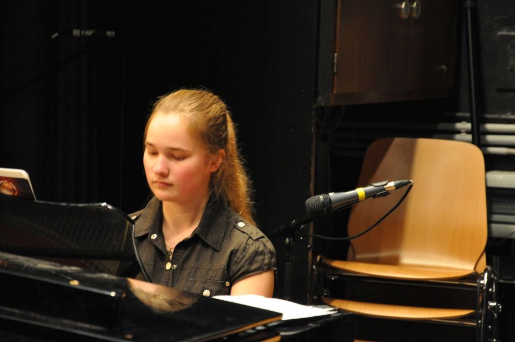 Weiter ging das bunte und abwechslungsreiche Programm mit klassischen Vorträgen: Melanie Pries am Klavier begleitete Sophie Minneker auf der Trompete beim ersten Satz der Sonata No.1 von J. Hook sowie dem „Blue Note Café“ von C. Cowles, während anschließend Simon Habenicht allein auf die Bühne trat. Ganz ohne Noten spielte er Praeludium und Fuge in c-Moll von J.S. Bach und begeisterte damit das Publikum in der vollbesetzten Aula. Nicht weniger Applaus erhielt das Duo Violetta Riedel und Lara Niehaves, die eine Interpretation des Popsongs „Diamonds“ von Rihanna vortrugen.